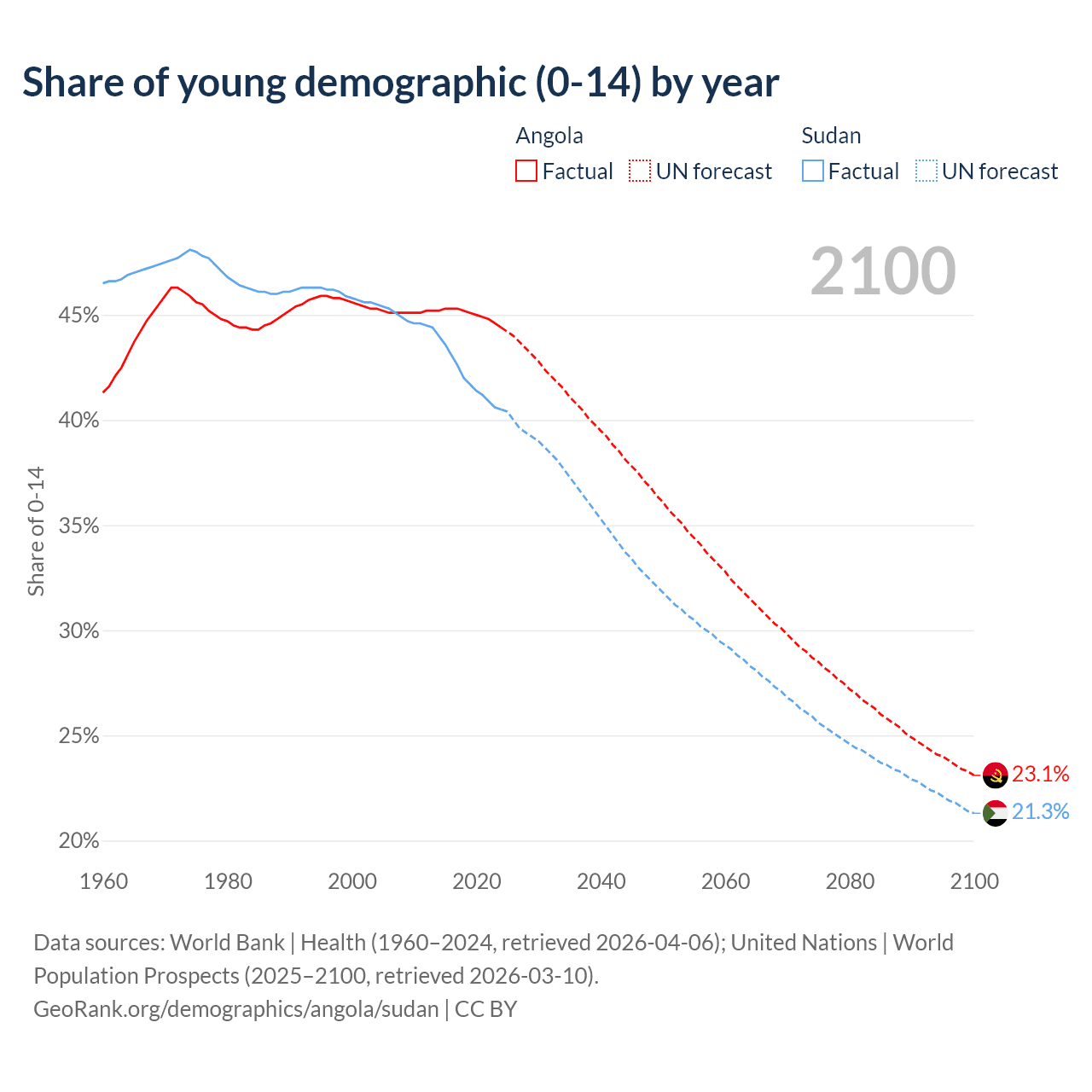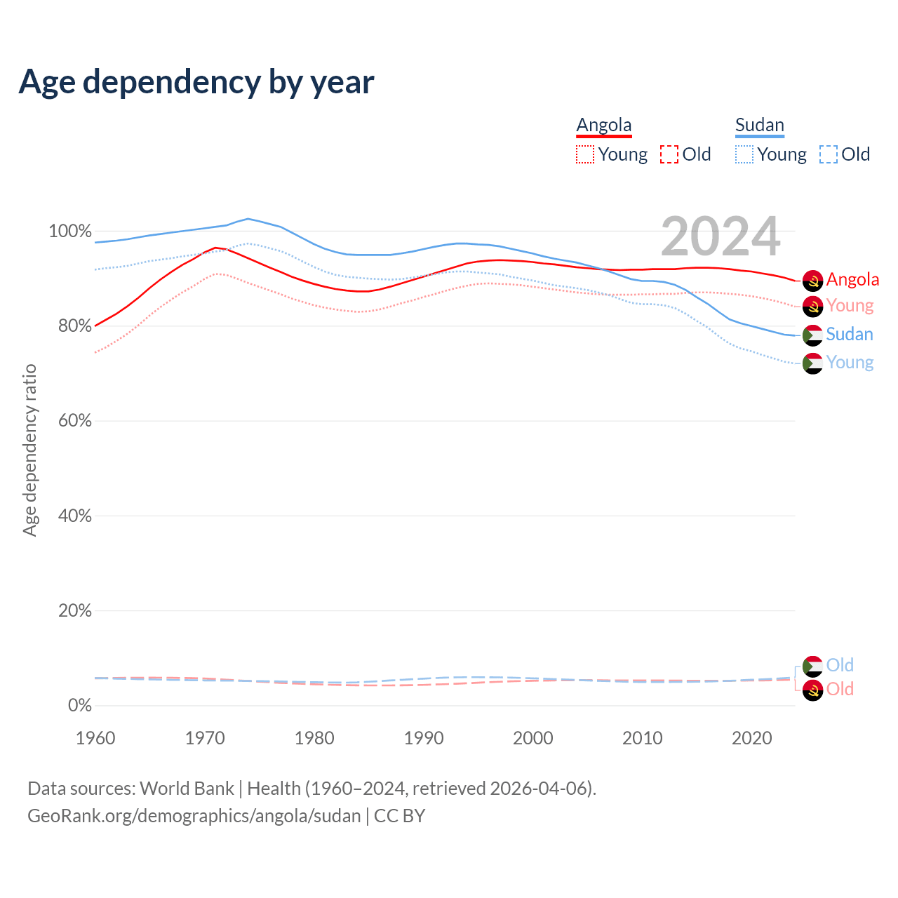 - Angola is ranked 188/196 by median age (oldest to youngest) vs 172/196 for Sudan.
