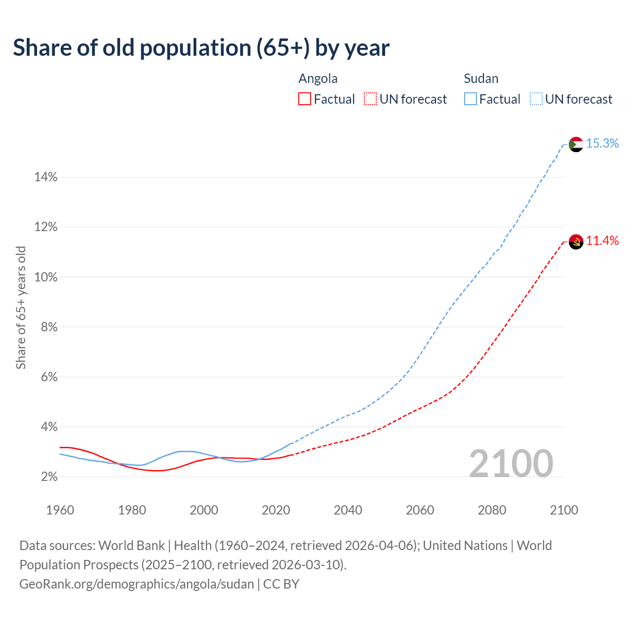 The share of older people aged 65 and over is 2.85% in Angola and 3.3% in Sudan. Life expectancy in Angola compared to Sudan .
