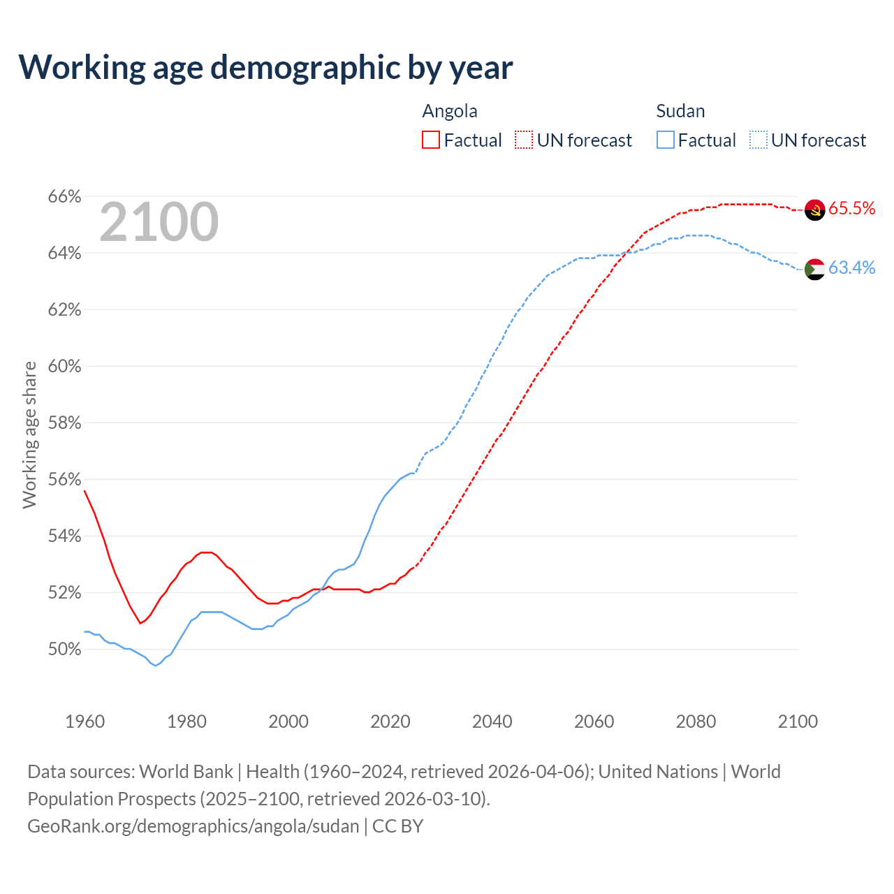 - Angola has 21.4M working age adults (aged 15-64) vs 30M in Sudan.