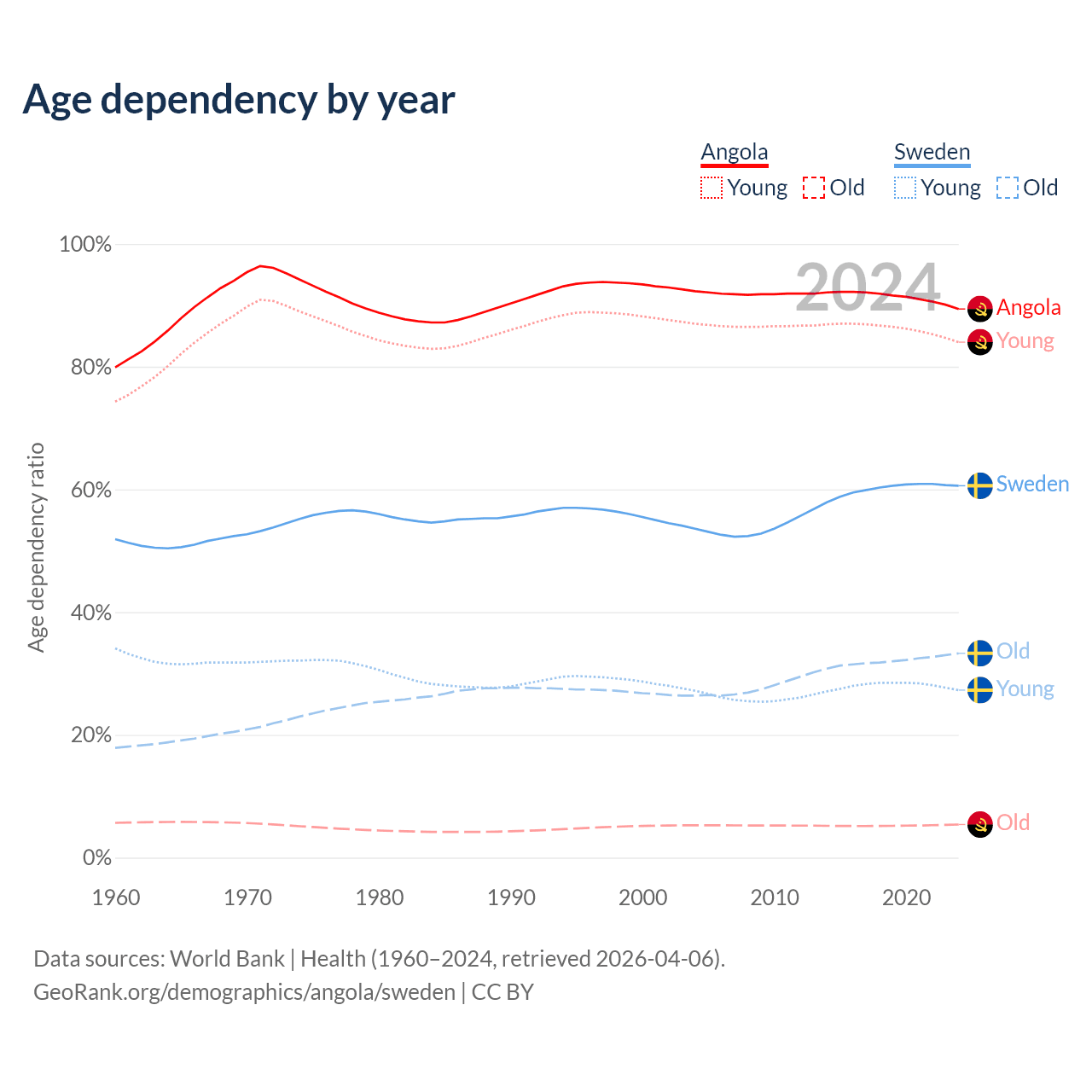 - Angola is ranked 188/196 by median age (oldest to youngest) vs 39/196 for Sweden.
