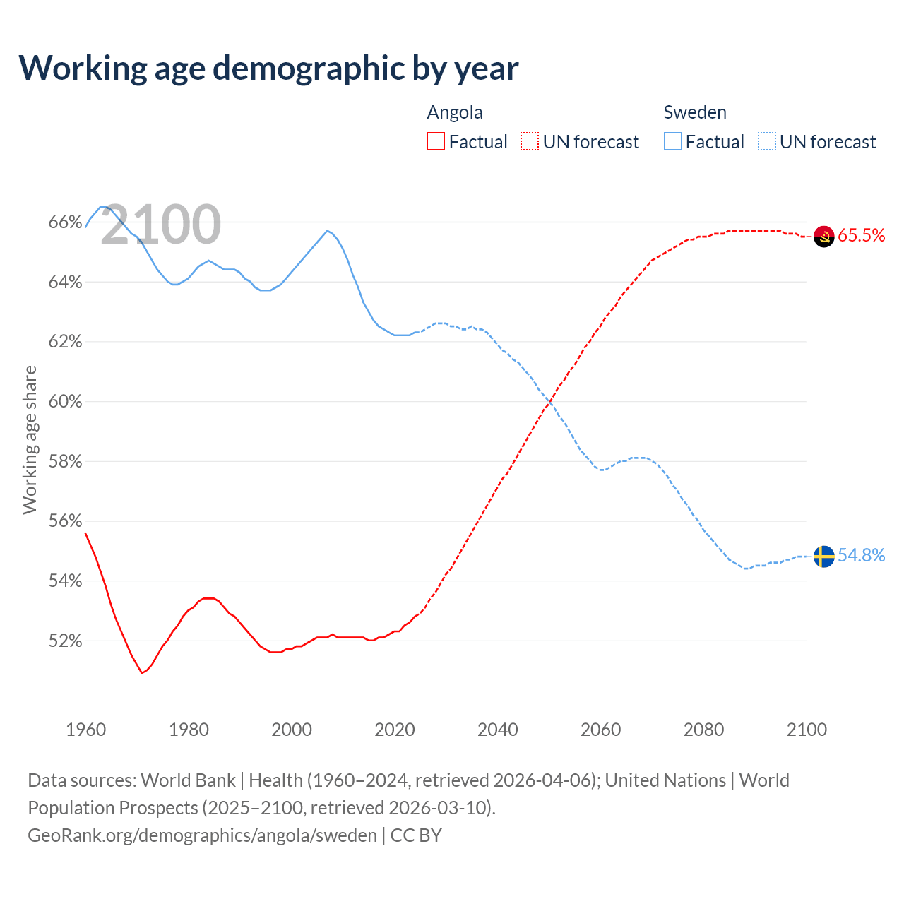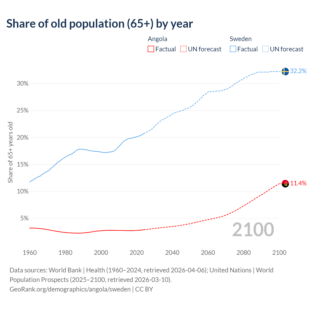 The share of older people aged 65 and over is 2.85% in Angola and 20.7% in Sweden. Life expectancy in Angola compared to Sweden .