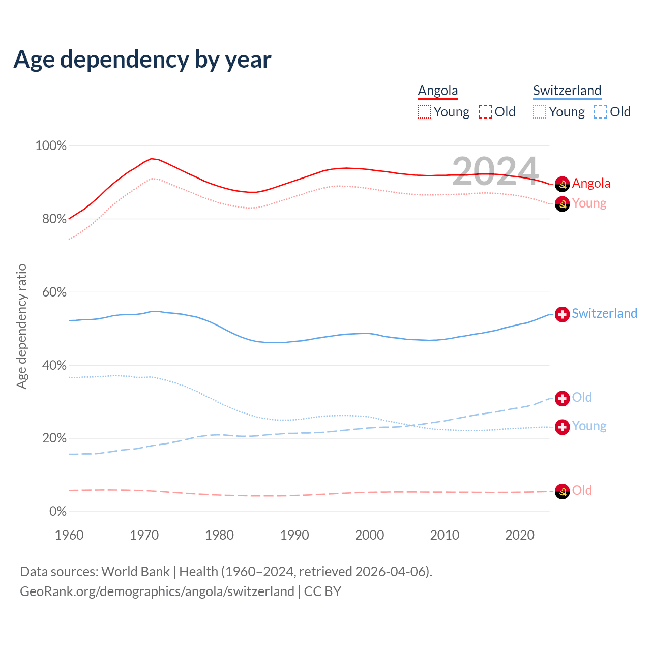 - Angola is ranked 188/196 by median age (oldest to youngest) vs 24/196 for Switzerland.