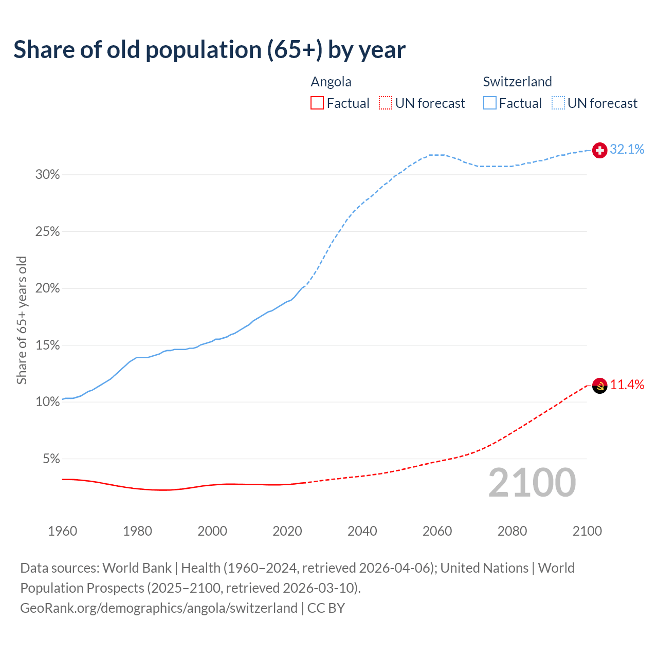 The share of older people aged 65 and over is 2.85% in Angola and 20% in Switzerland. Life expectancy in Angola compared to Switzerland .