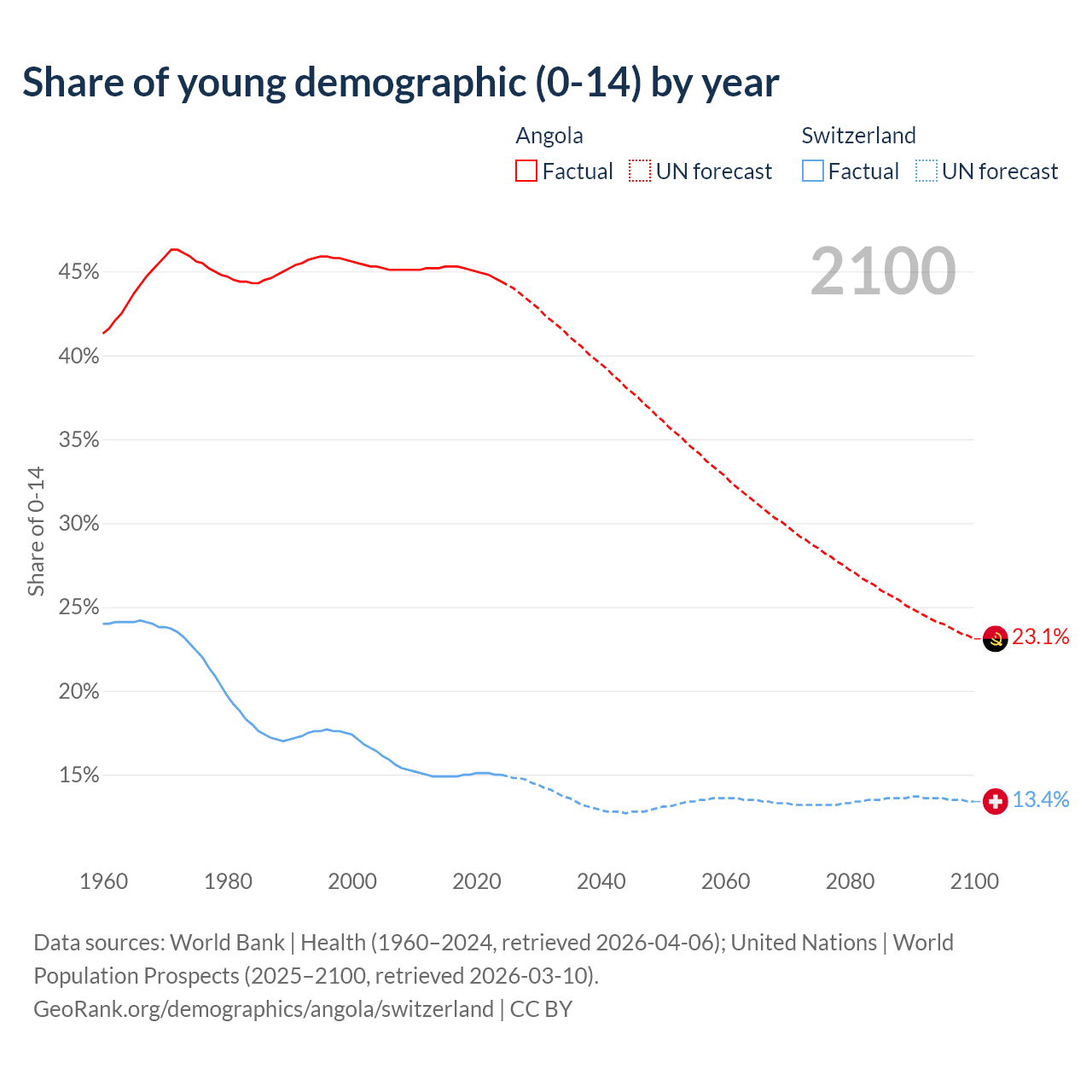 - The share of young demographic (0-15 years old) in Angola is 44.4% vs 15% in Switzerland.