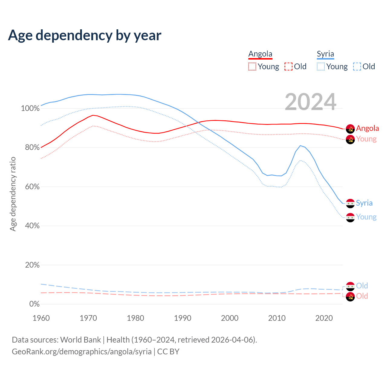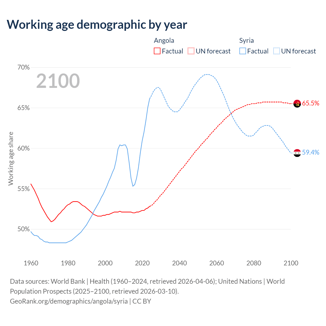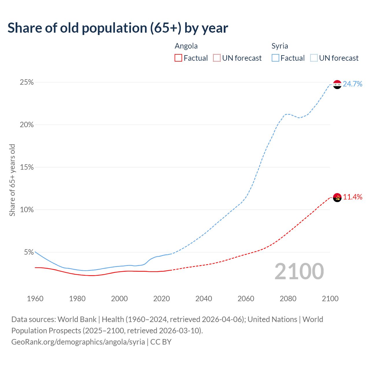 The share of older people aged 65 and over is 2.85% in Angola and 4.74% in Syria. Life expectancy in Angola compared to Syria .