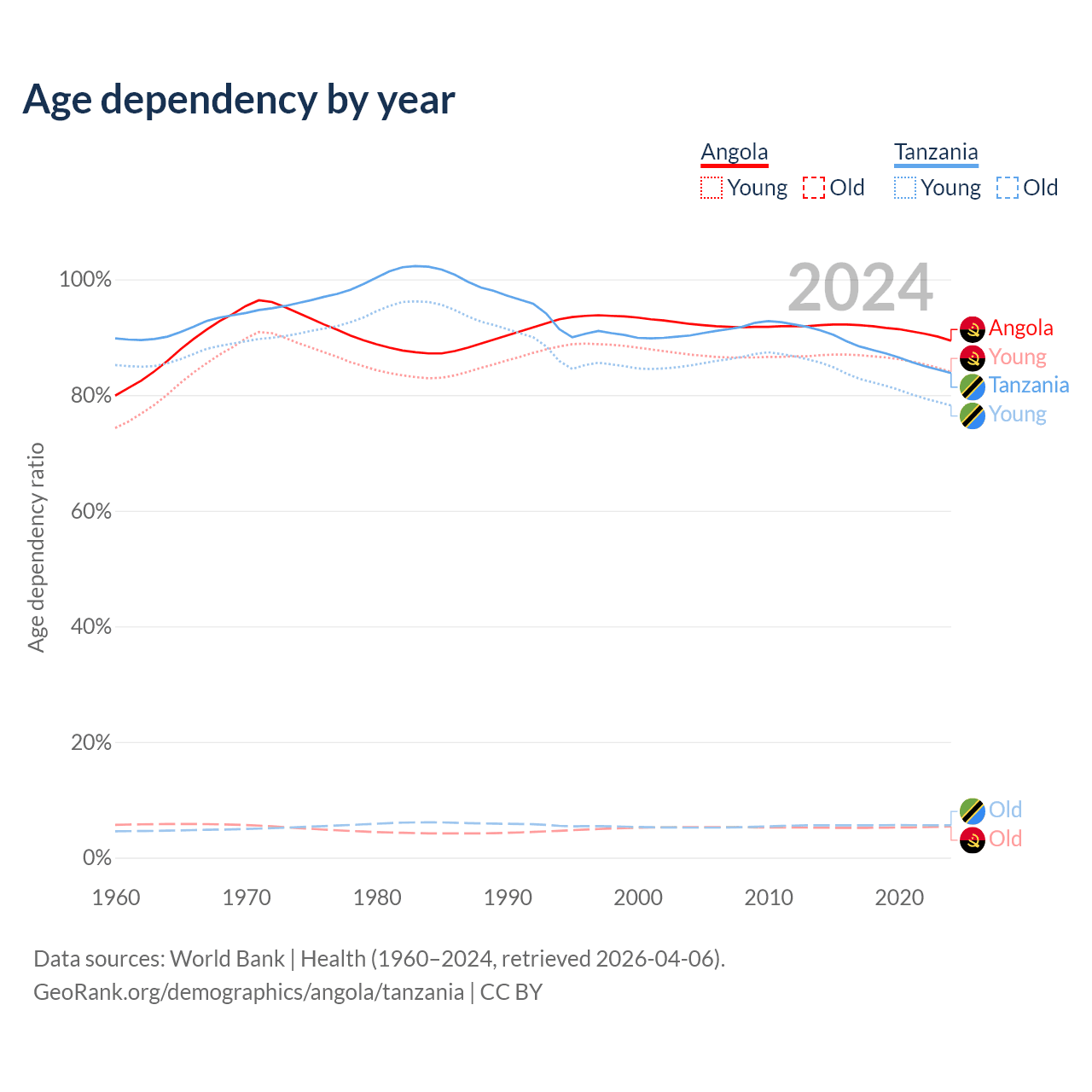Data sources: World Bank | Health (1960–2024, retrieved 2026-04-06); U.S. Census Bureau (1960–2024, retrieved 2026-02-08).