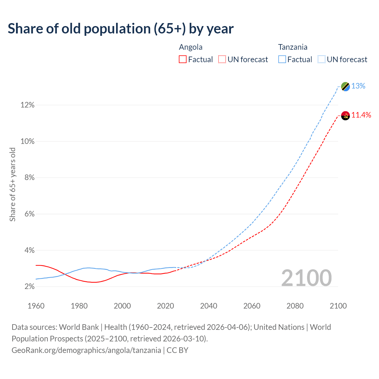The share of older people aged 65 and over is 2.85% in Angola and 3.05% in Tanzania. Life expectancy in Angola compared to Tanzania .