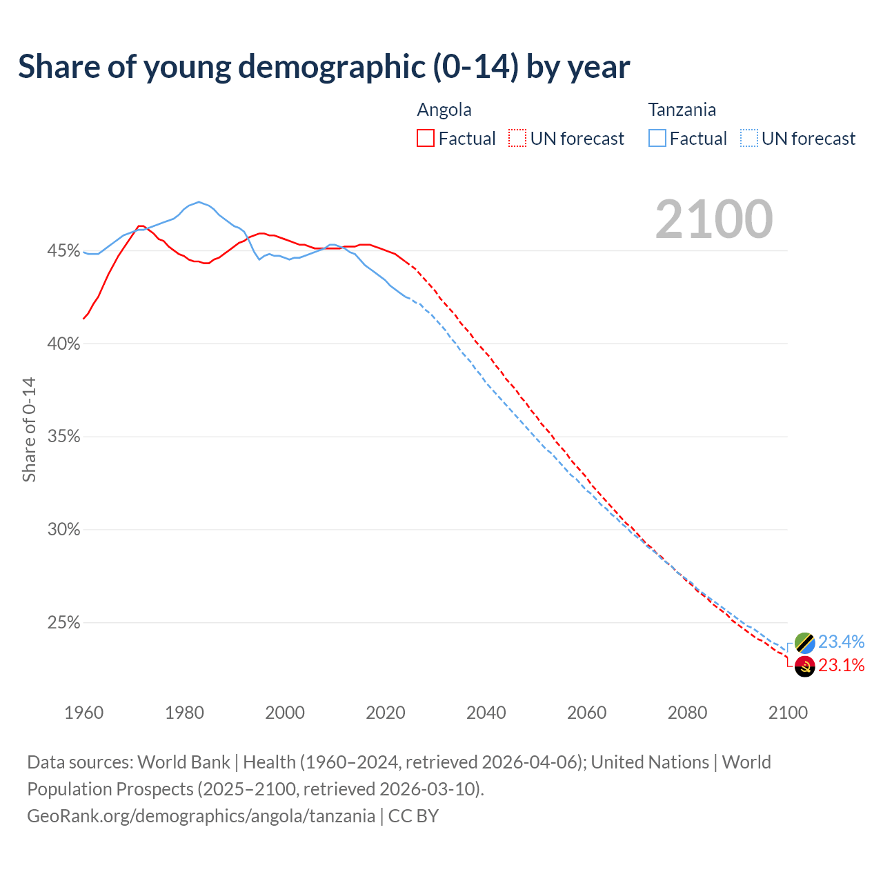 - The share of young demographic (0-15 years old) in Angola is 44.4% vs 42.5% in Tanzania.