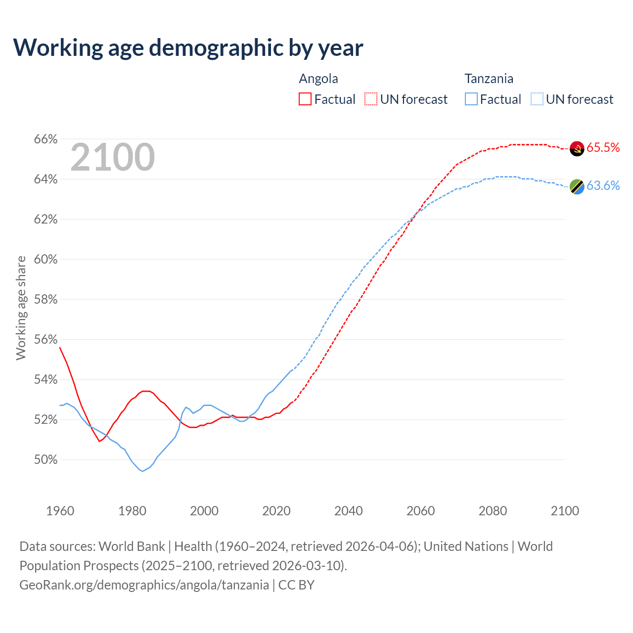 Median age Angola vs Tanzania, 1960-2100