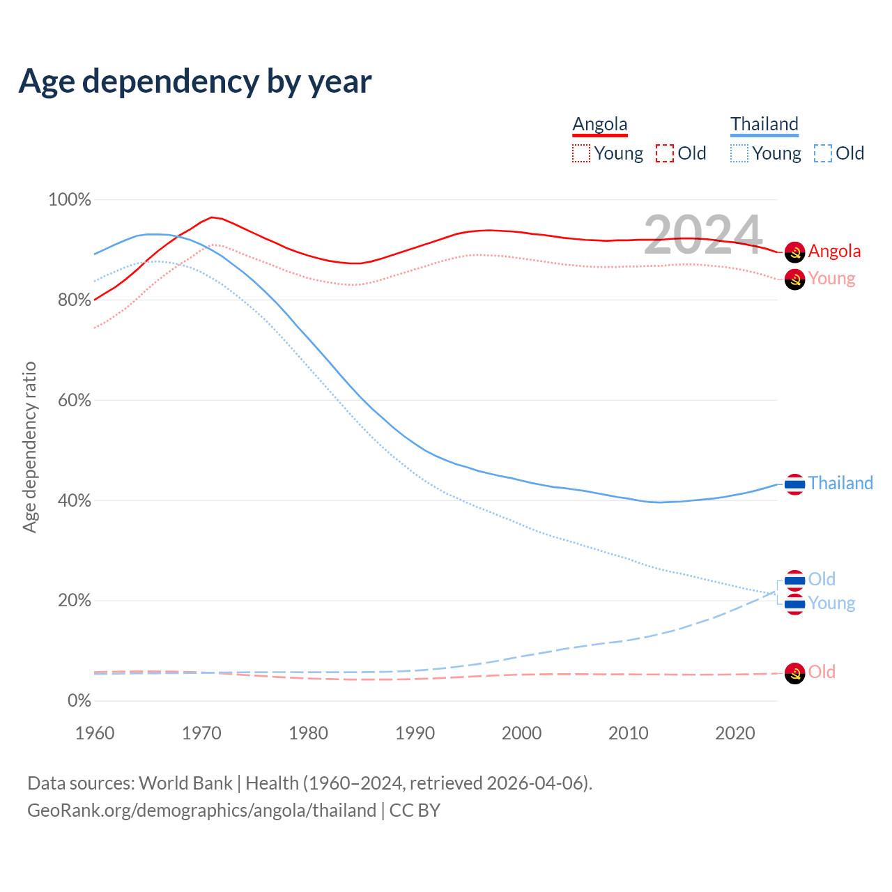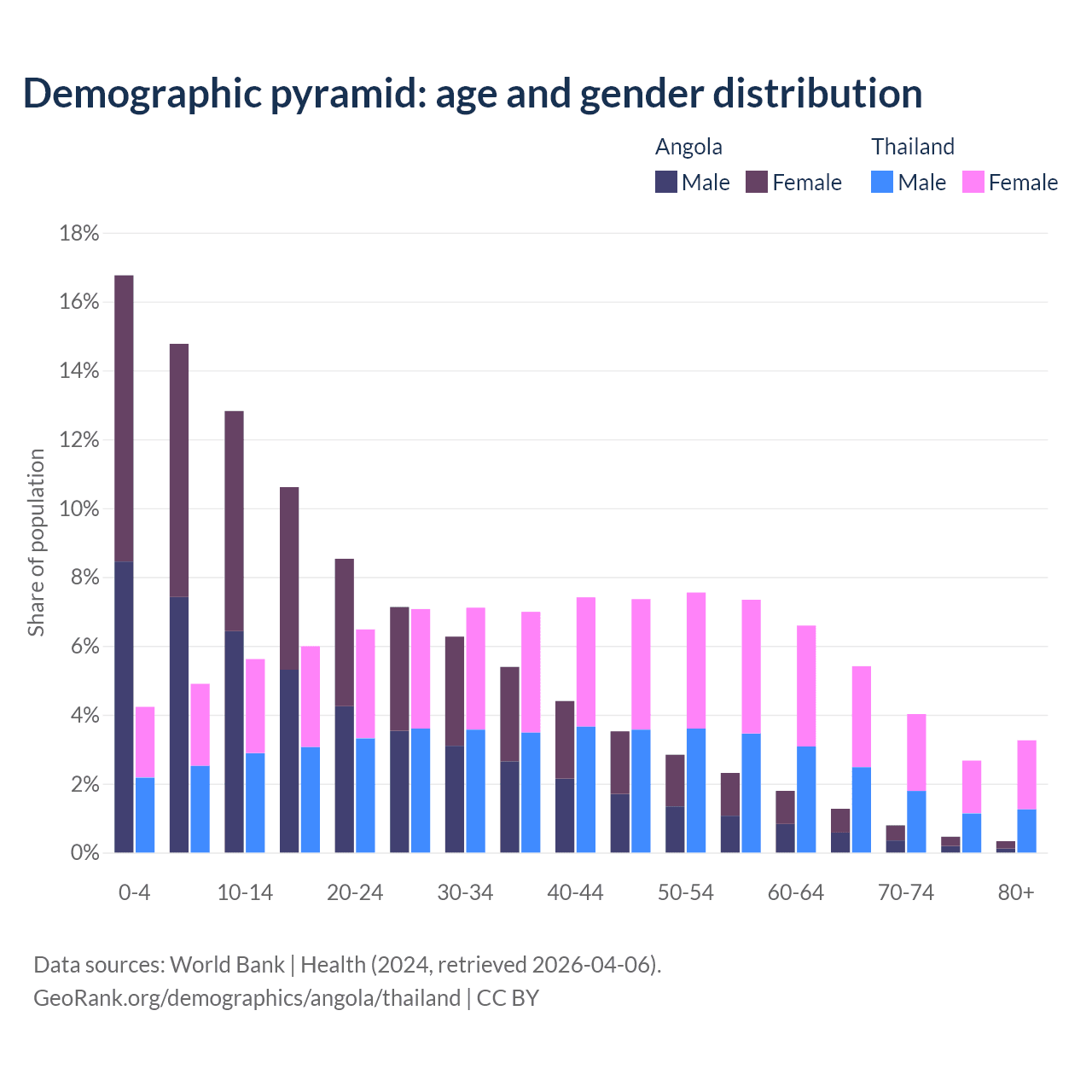 - Angola is ranked 188/196 by median age (oldest to youngest) vs 40/196 for Thailand.