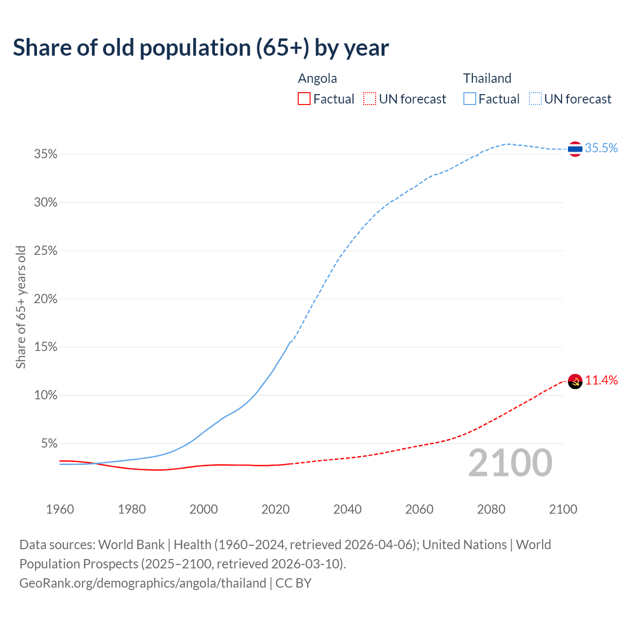 The share of older people aged 65 and over is 2.85% in Angola and 15.4% in Thailand. Life expectancy in Angola compared to Thailand .