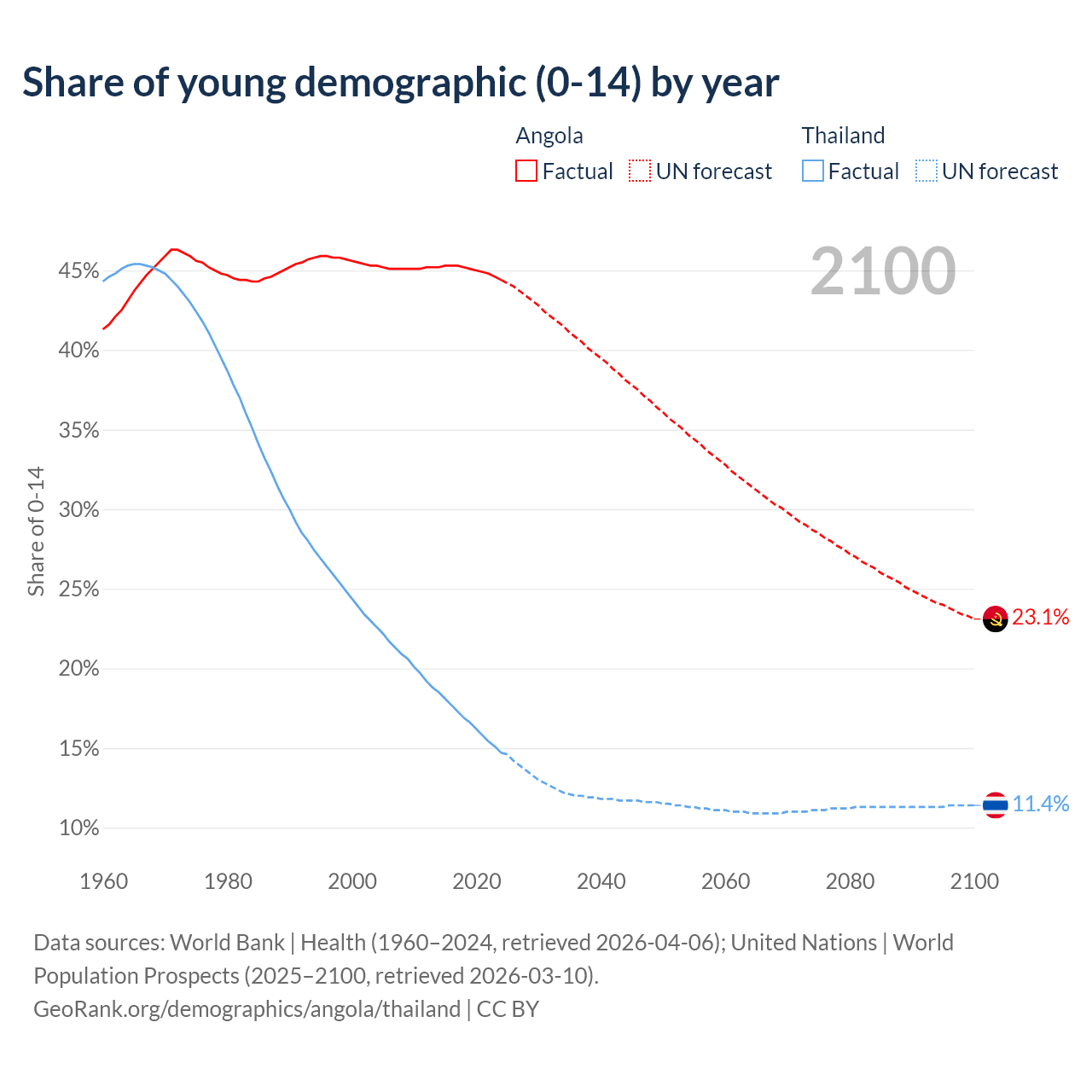- The share of young demographic (0-15 years old) in Angola is 44.4% vs 14.7% in Thailand.