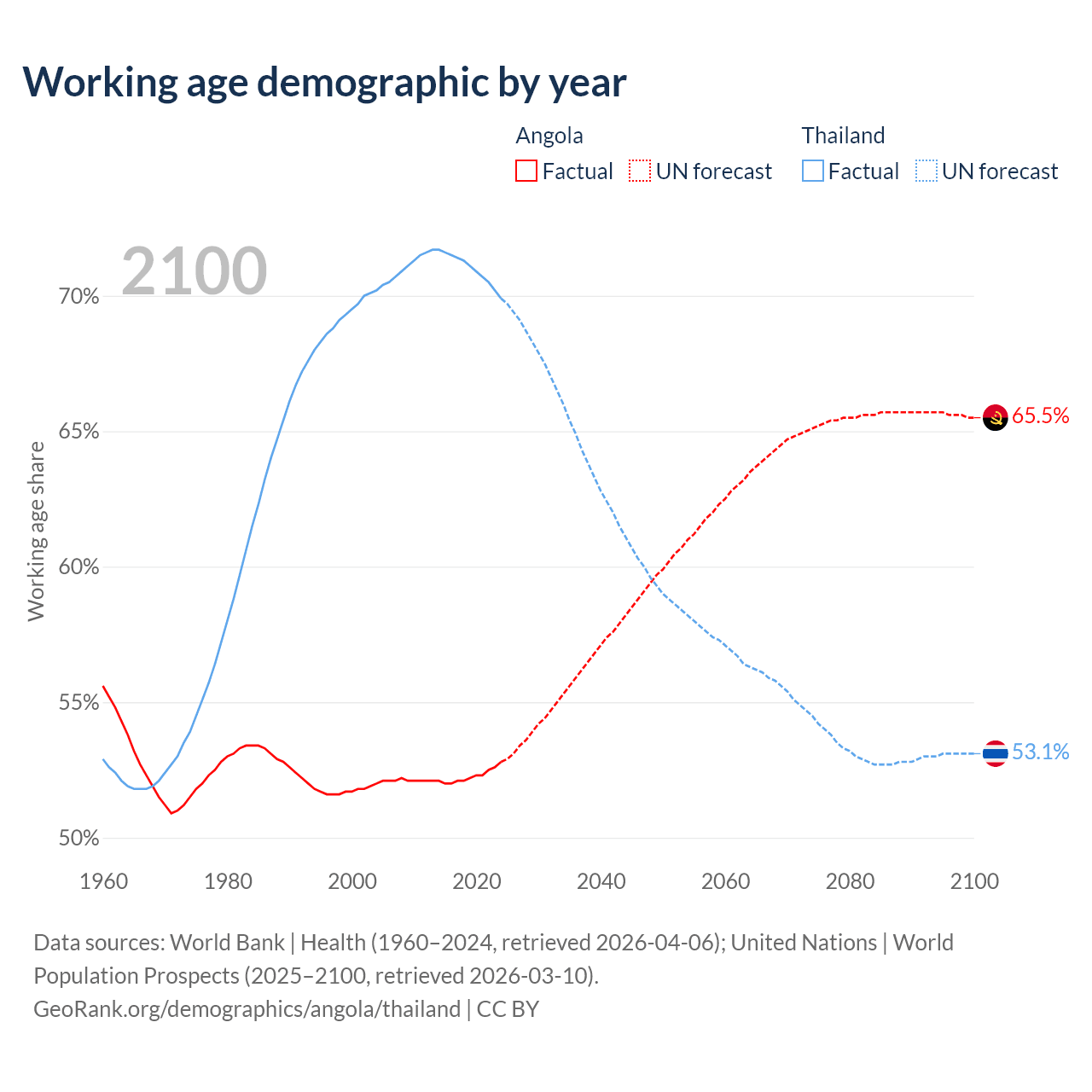 - Angola has 21.4M working age adults (aged 15-64) vs 50M in Thailand.