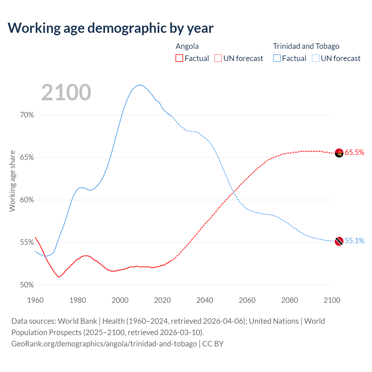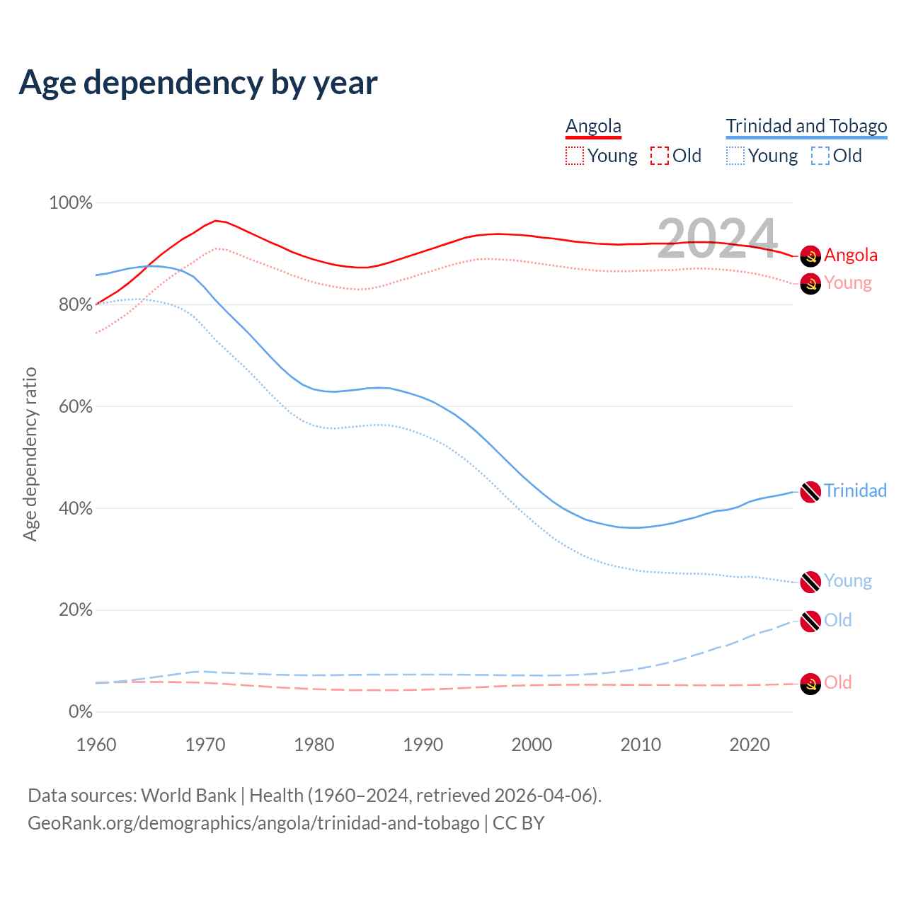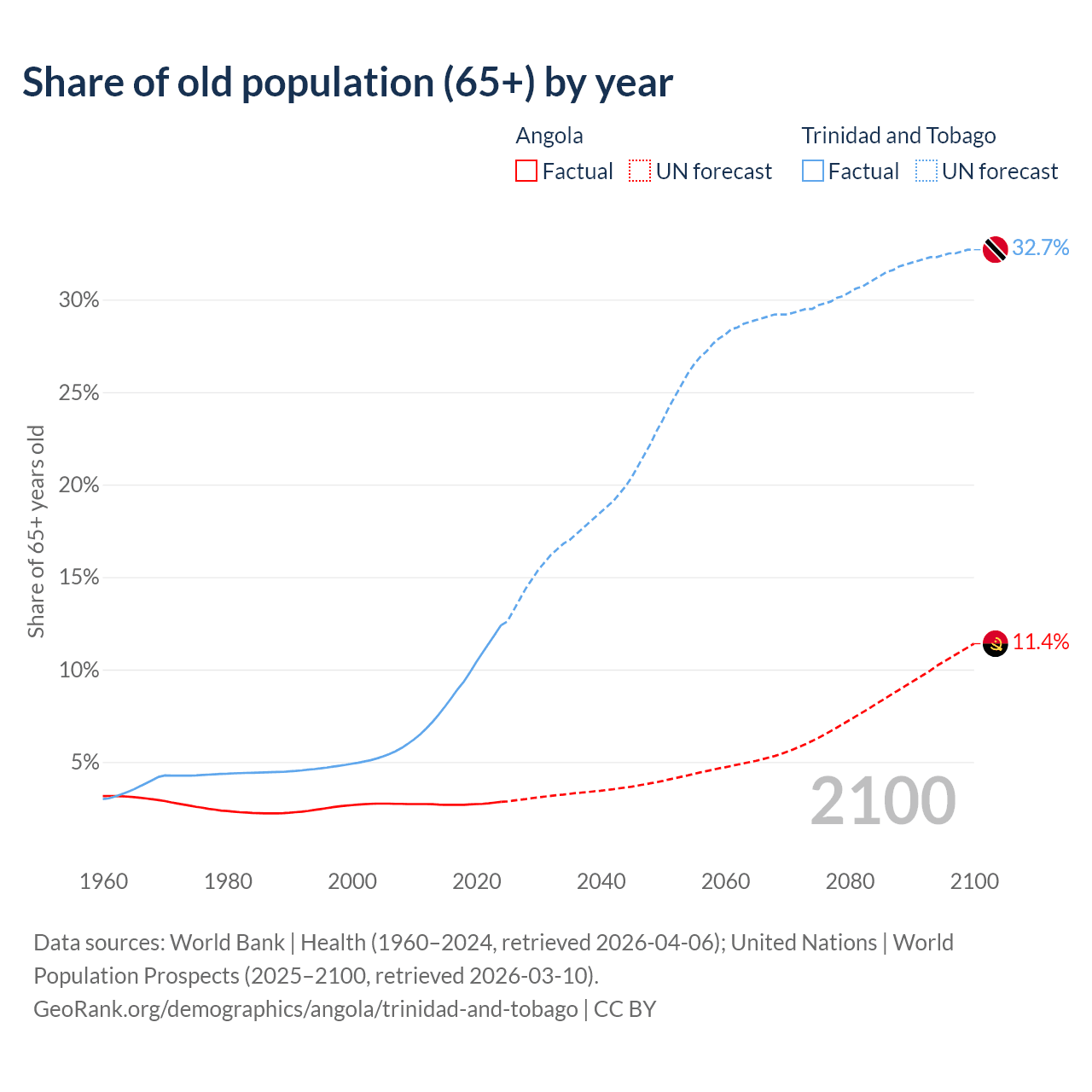 The share of older people aged 65 and over is 2.85% in Angola and 12.4% in Trinidad and Tobago. Life expectancy in Angola compared to Trinidad and Tobago .