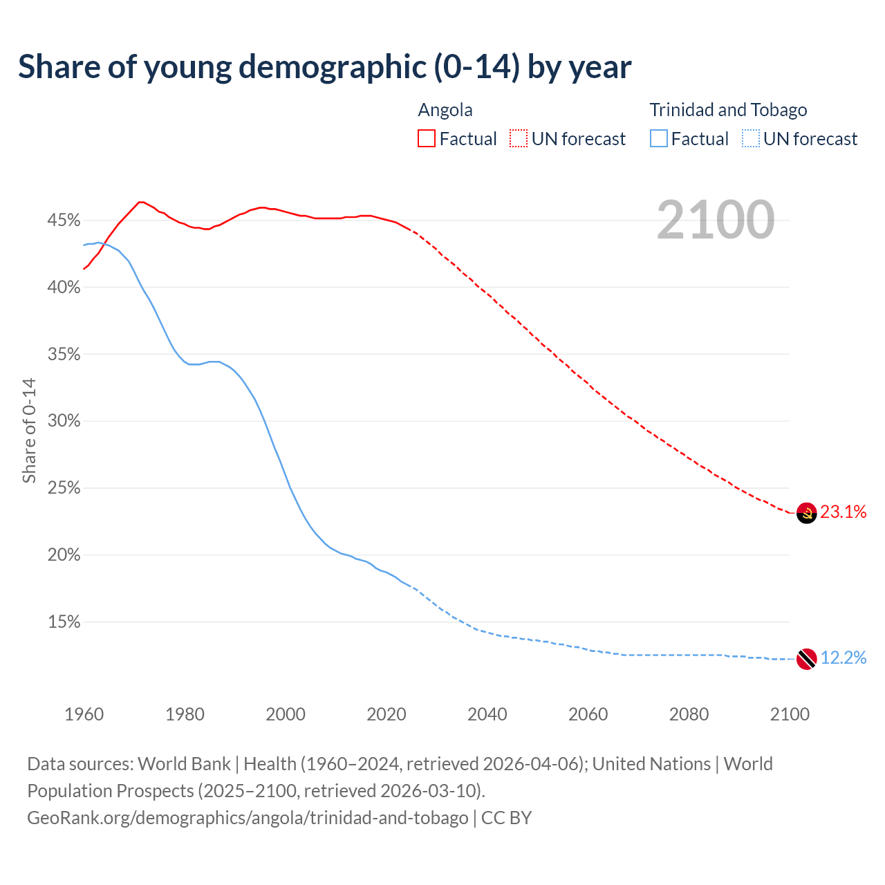 - The share of young demographic (0-15 years old) in Angola is 44.4% vs 17.8% in Trinidad and Tobago.