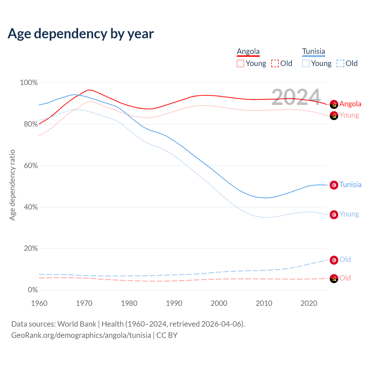 - Angola is ranked 188/196 by median age (oldest to youngest) vs 86/196 for Tunisia.