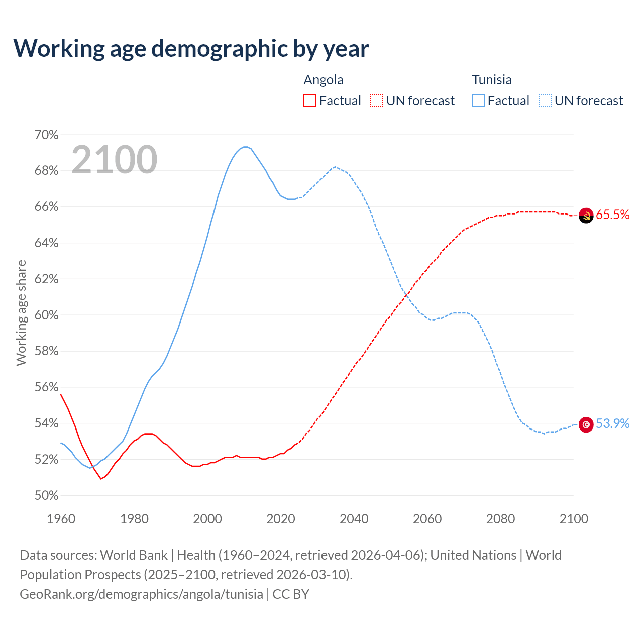 - Angola has 21.4M working age adults (aged 15-64) vs 8.26M in Tunisia.