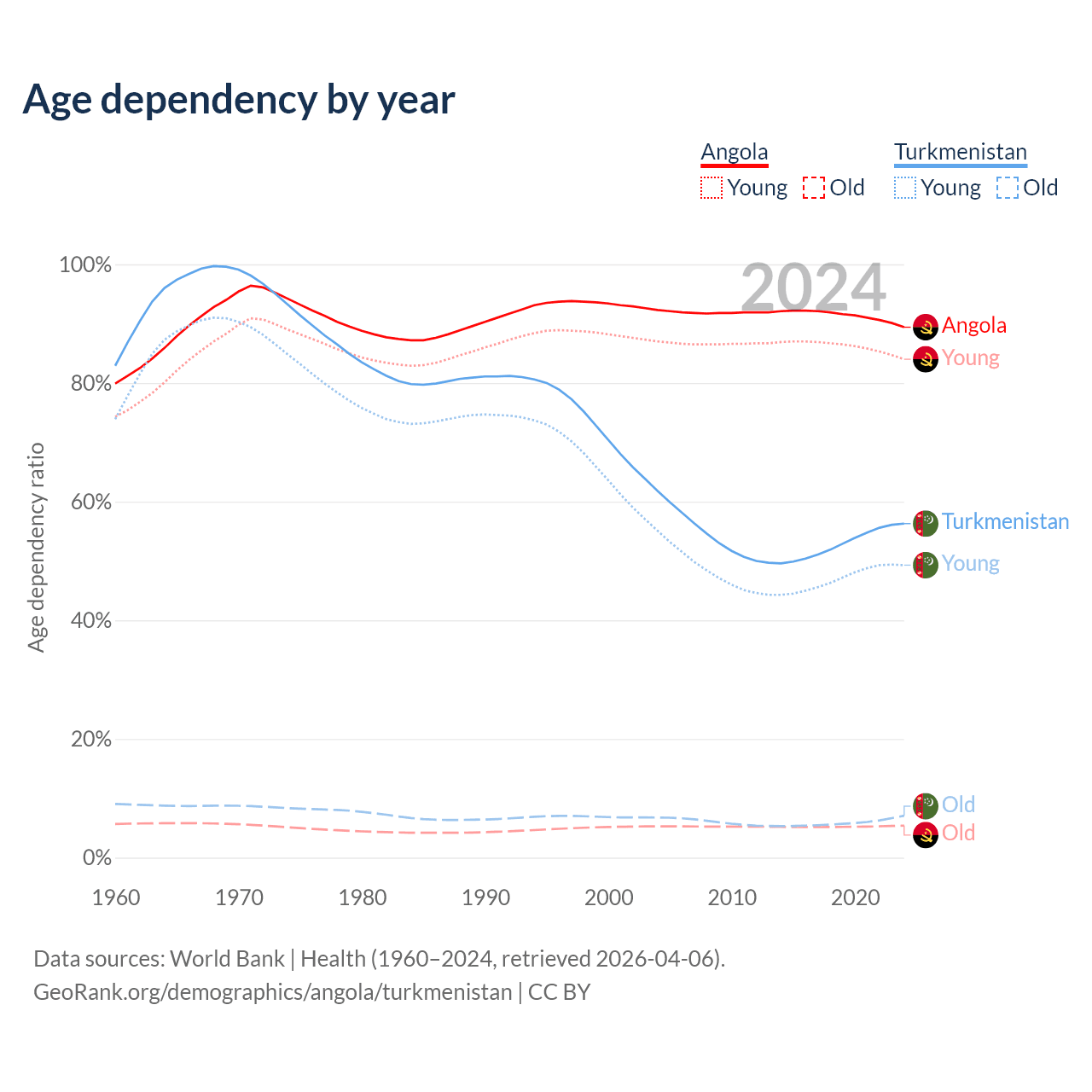 - Angola is ranked 188/196 by median age (oldest to youngest) vs 119/196 for Turkmenistan.