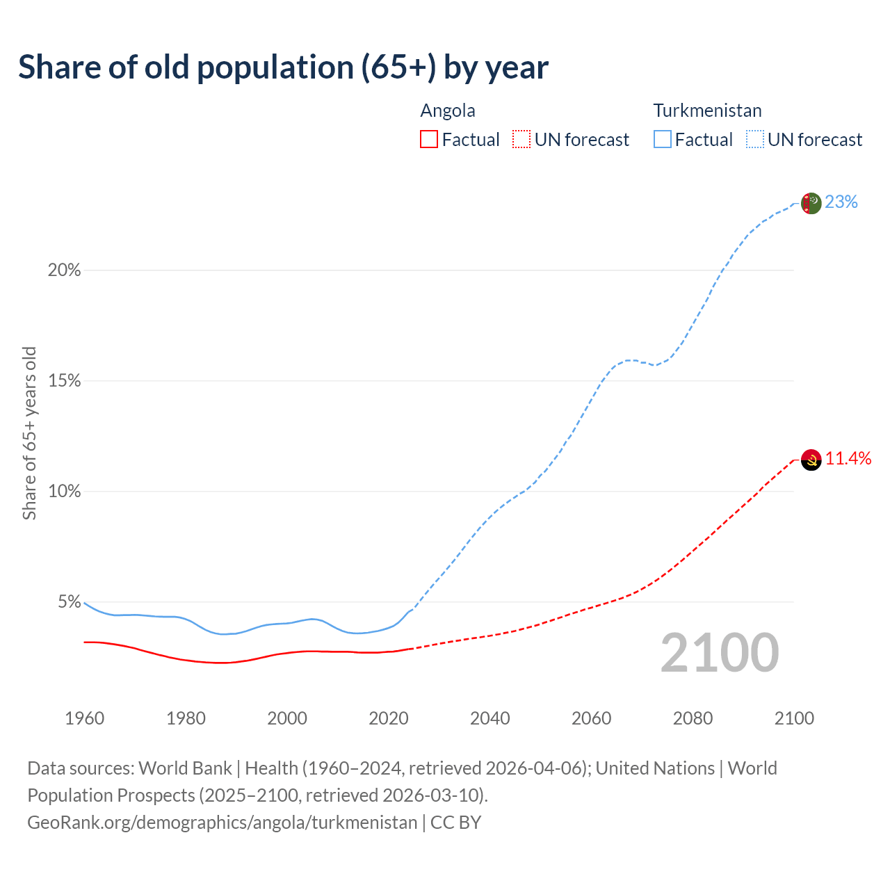 The share of older people aged 65 and over is 2.85% in Angola and 4.53% in Turkmenistan. Life expectancy in Angola compared to Turkmenistan .