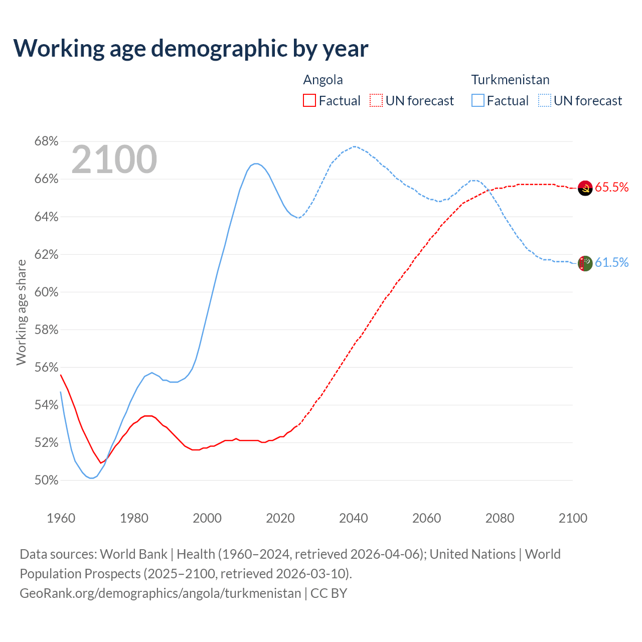 - Angola has 21.4M working age adults (aged 15-64) vs 4.97M in Turkmenistan.