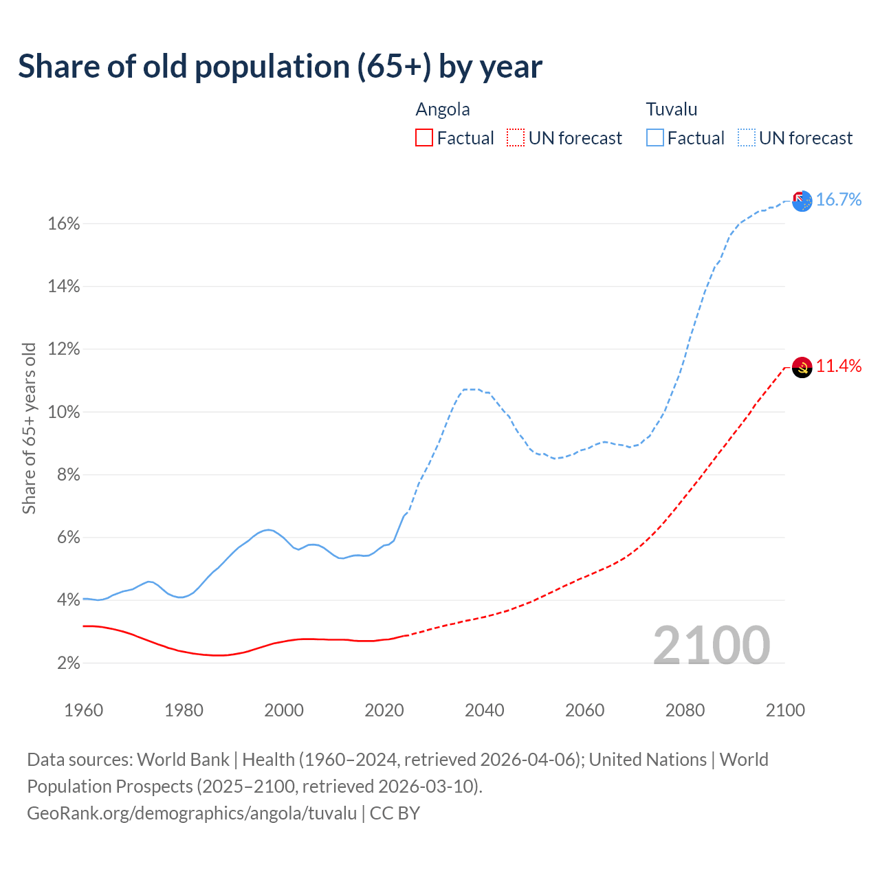 - The share of old-age demographic (65+) in Angola is 2.85% vs 6.67% in Tuvalu.