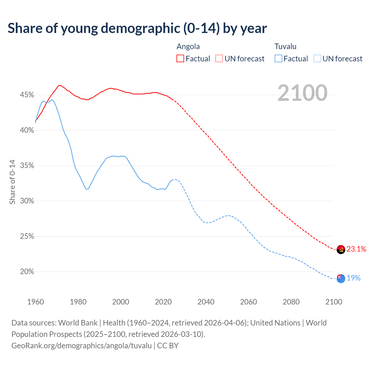 - The share of young demographic (0-15 years old) in Angola is 44.4% vs 32.9% in Tuvalu.