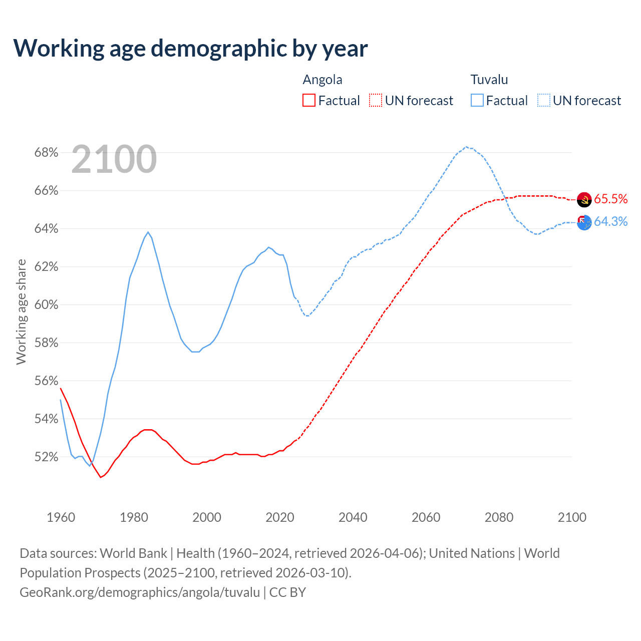 - Angola has 21.4M working age adults (aged 15-64) vs 5.64K in Tuvalu.