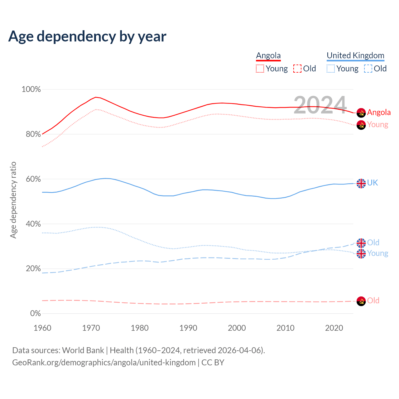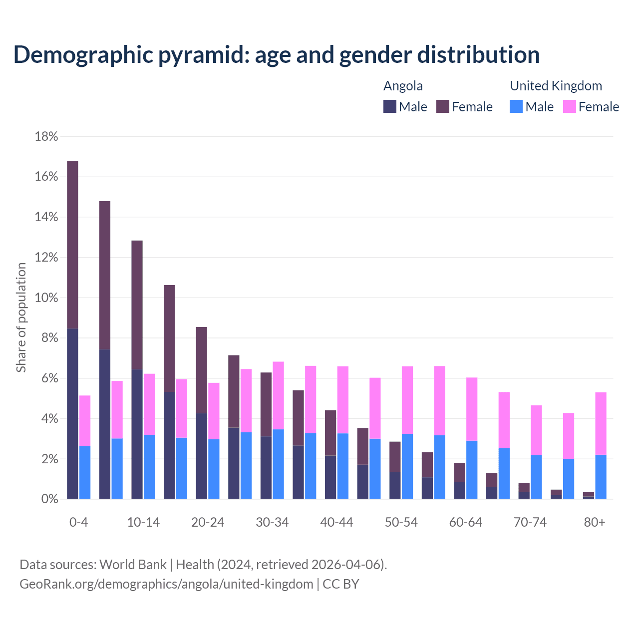 - Angola is ranked 188/196 by median age (oldest to youngest) vs 41/196 for the United Kingdom.