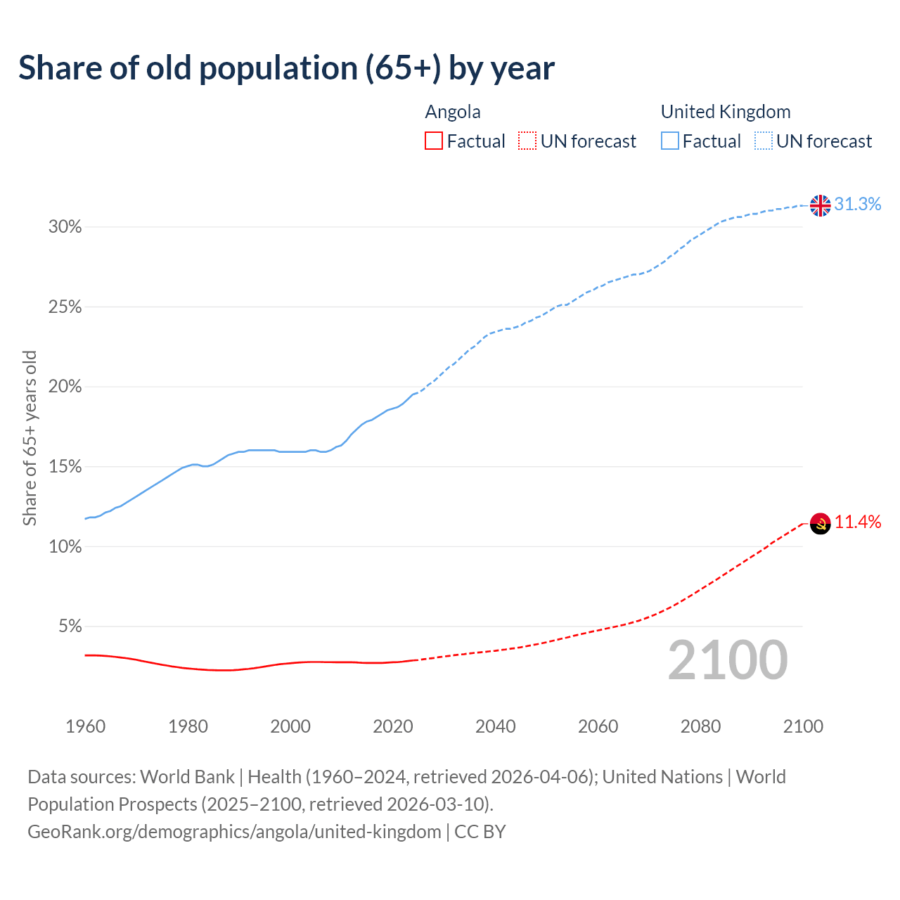 The share of older people aged 65 and over is 2.85% in Angola and 19.5% in the United Kingdom. Life expectancy in Angola compared to the United Kingdom .