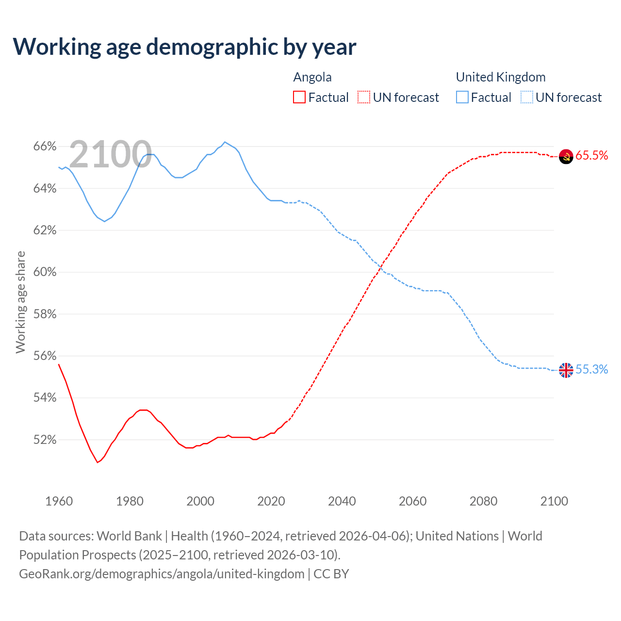 - Angola has 21.4M working age adults (aged 15-64) vs 44.4M in the United Kingdom.