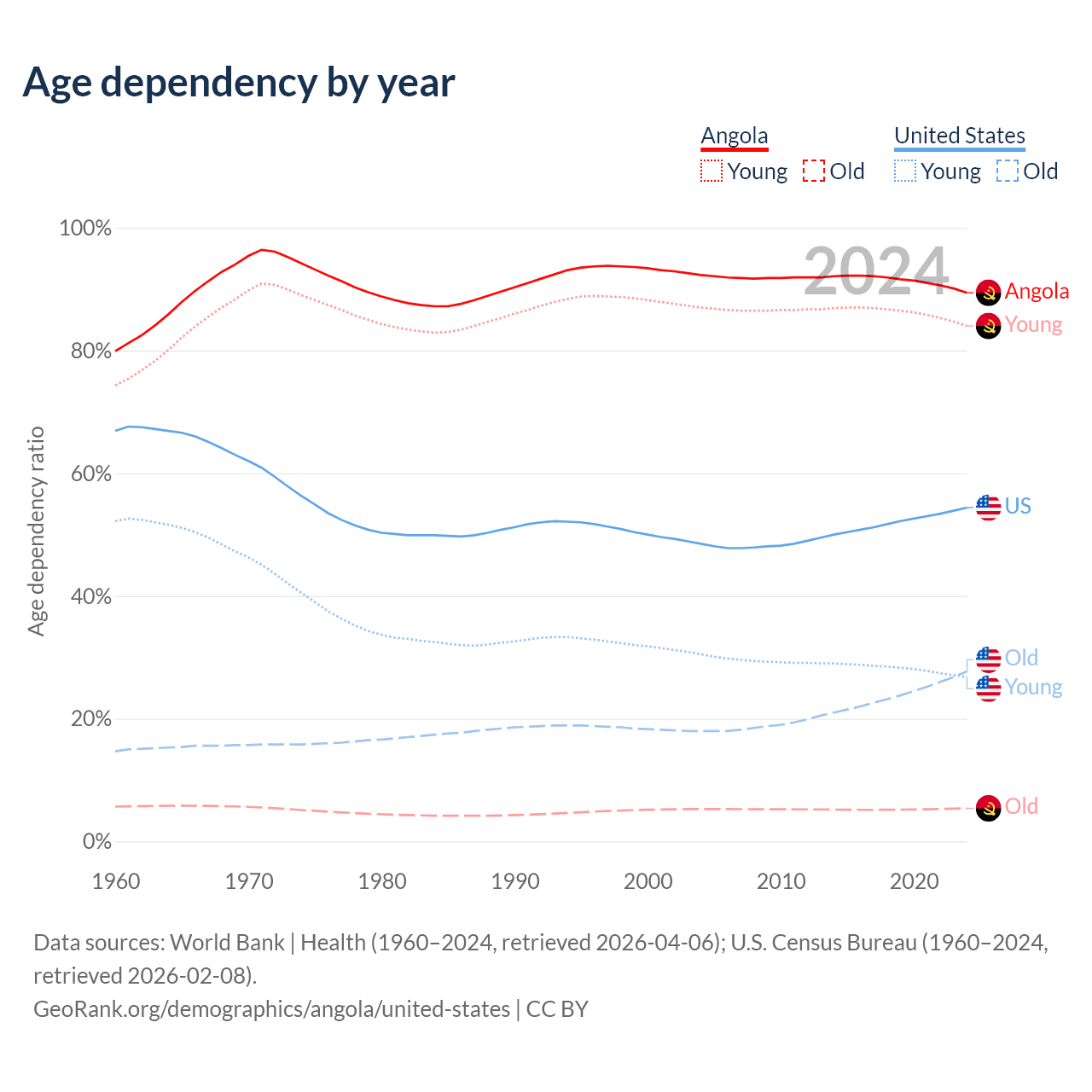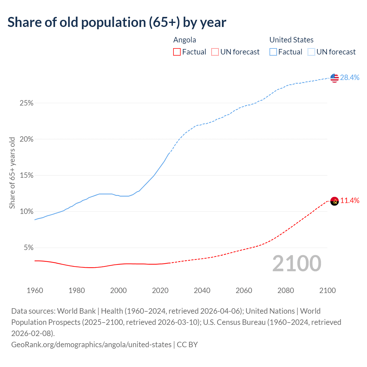 The share of older people aged 65 and over is 2.85% in Angola and 17.9% in the United States. Life expectancy in Angola compared to the United States .