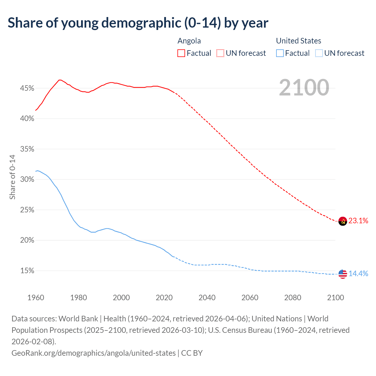 - The share of young demographic (0-15 years old) in Angola is 44.4% vs 17.3% in the United States.