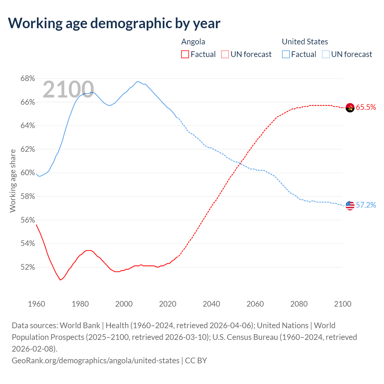 Median age Angola vs United States, 1960-2100