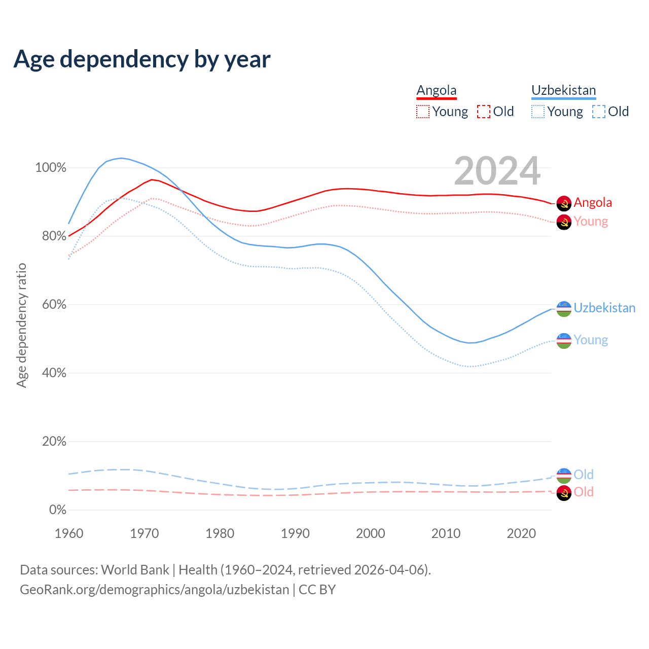 Data sources: World Bank | Health (1960–2024, retrieved 2026-04-06); U.S. Census Bureau (1960–2024, retrieved 2026-02-08).