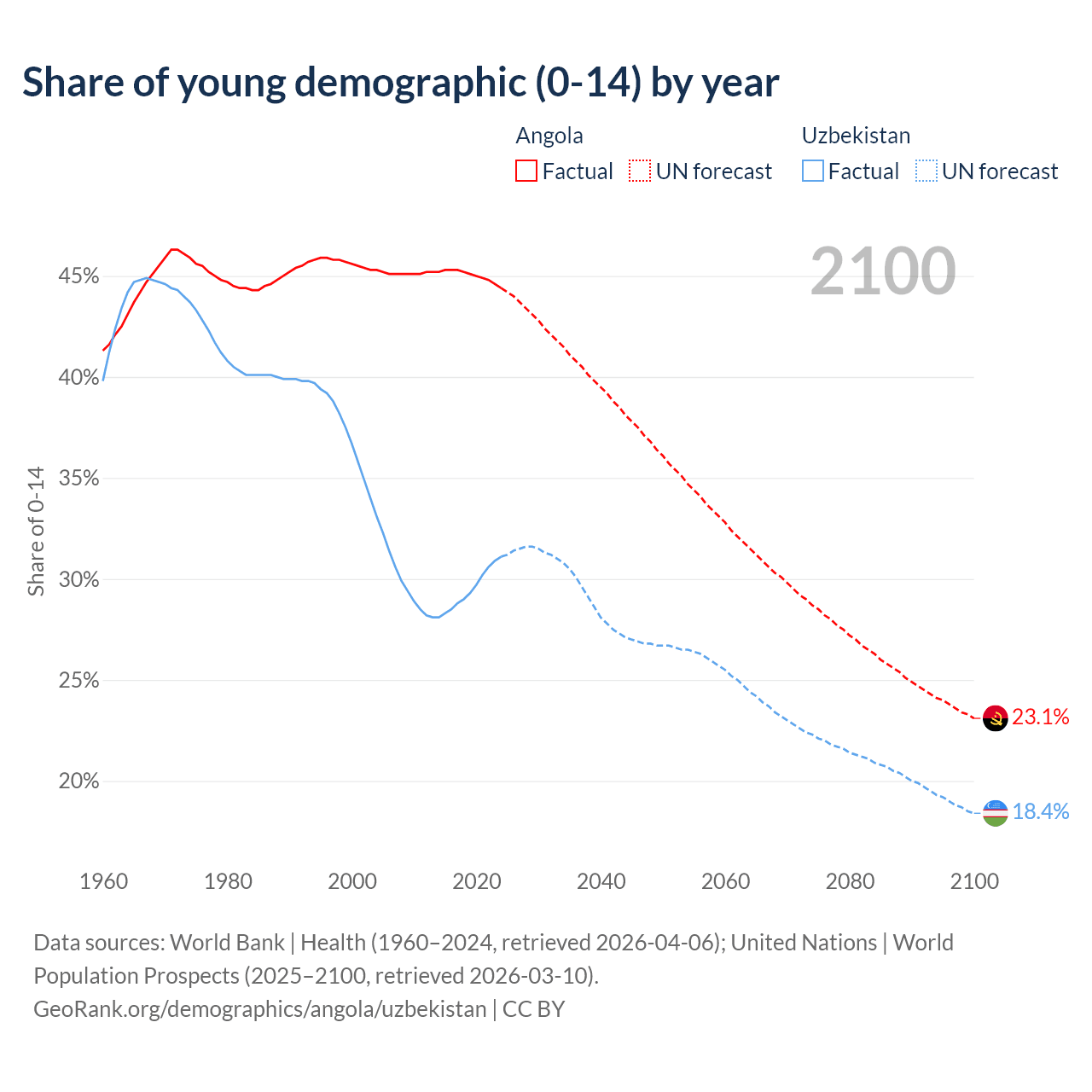 - The share of young demographic (0-15 years old) in Angola is 44.4% vs 31.1% in Uzbekistan.