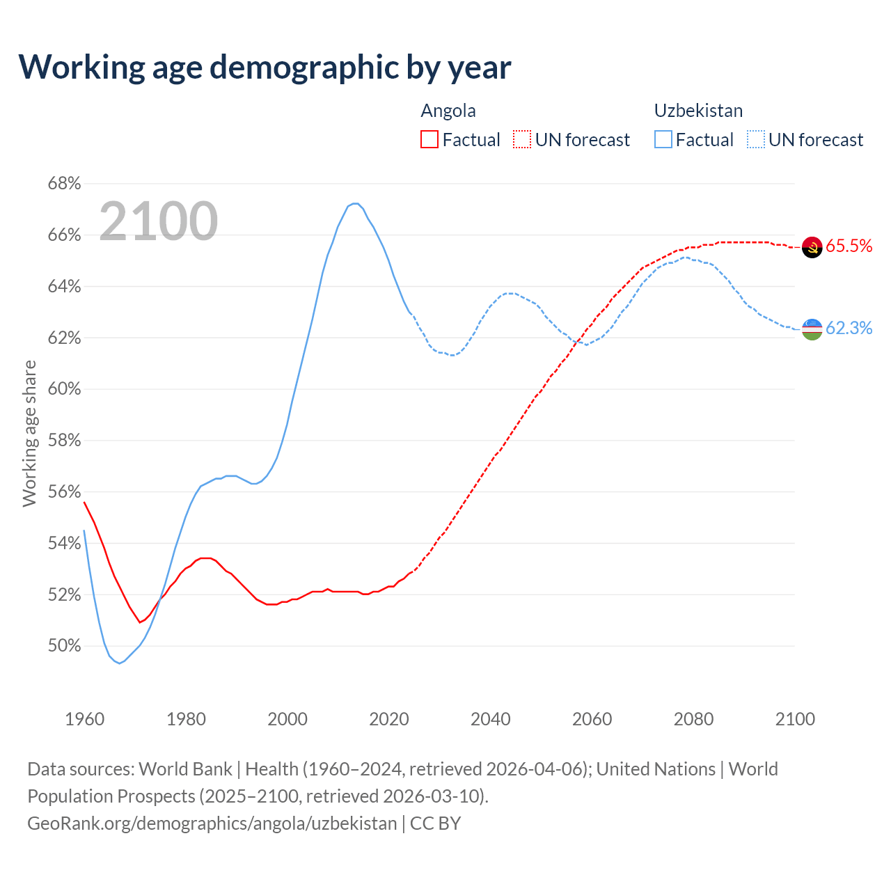 The share of older people aged 65 and over is 2.85% in Angola and 5.86% in Uzbekistan. Life expectancy in Angola compared to Uzbekistan .