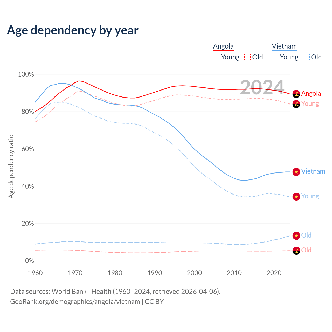 - Angola is ranked 188/196 by median age (oldest to youngest) vs 84/196 for Vietnam.