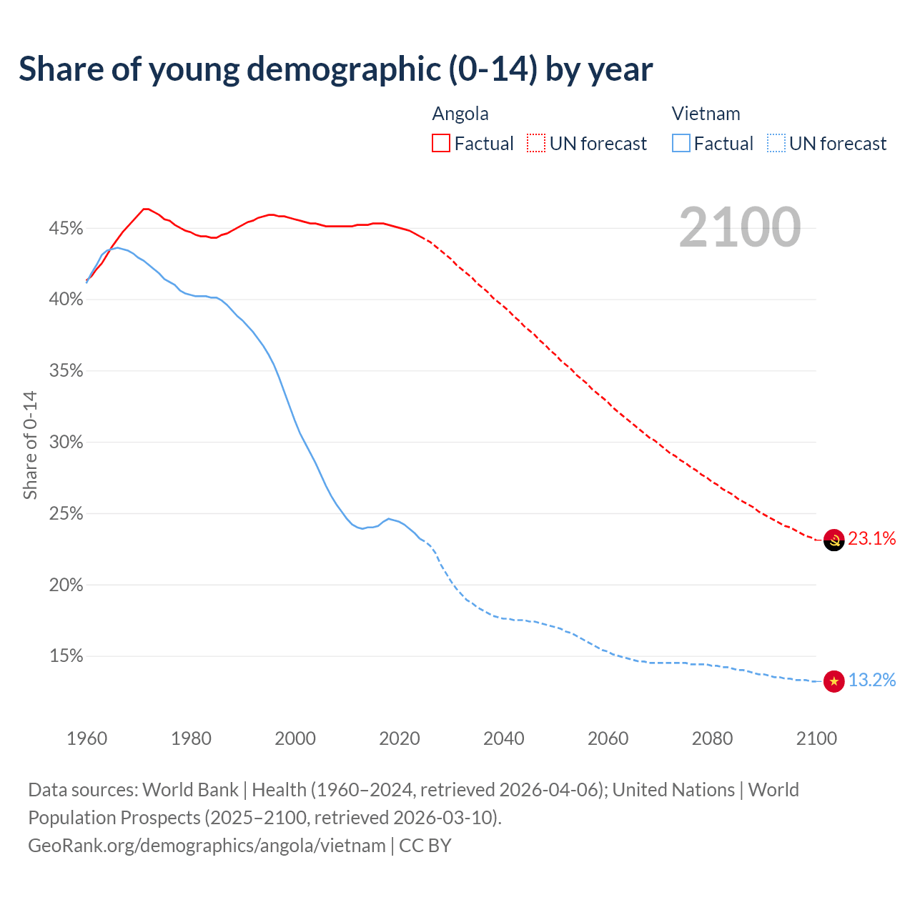 - The share of young demographic (0-15 years old) in Angola is 44.4% vs 23.2% in Vietnam.