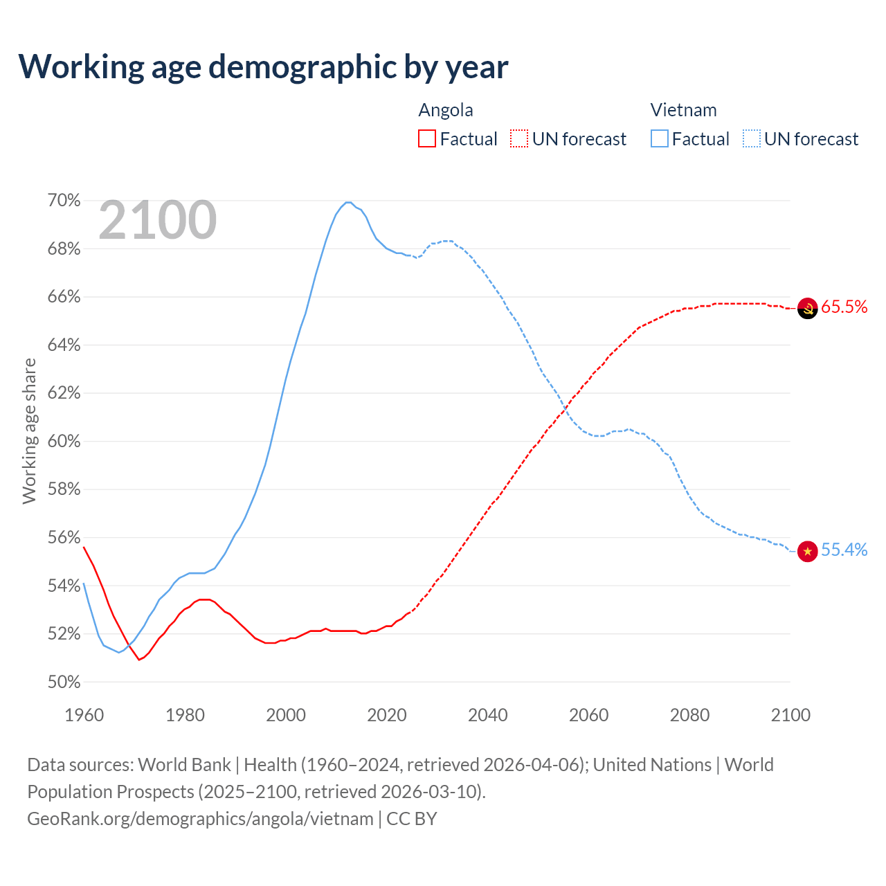 - Angola has 21.4M working age adults (aged 15-64) vs 69.3M in Vietnam.
