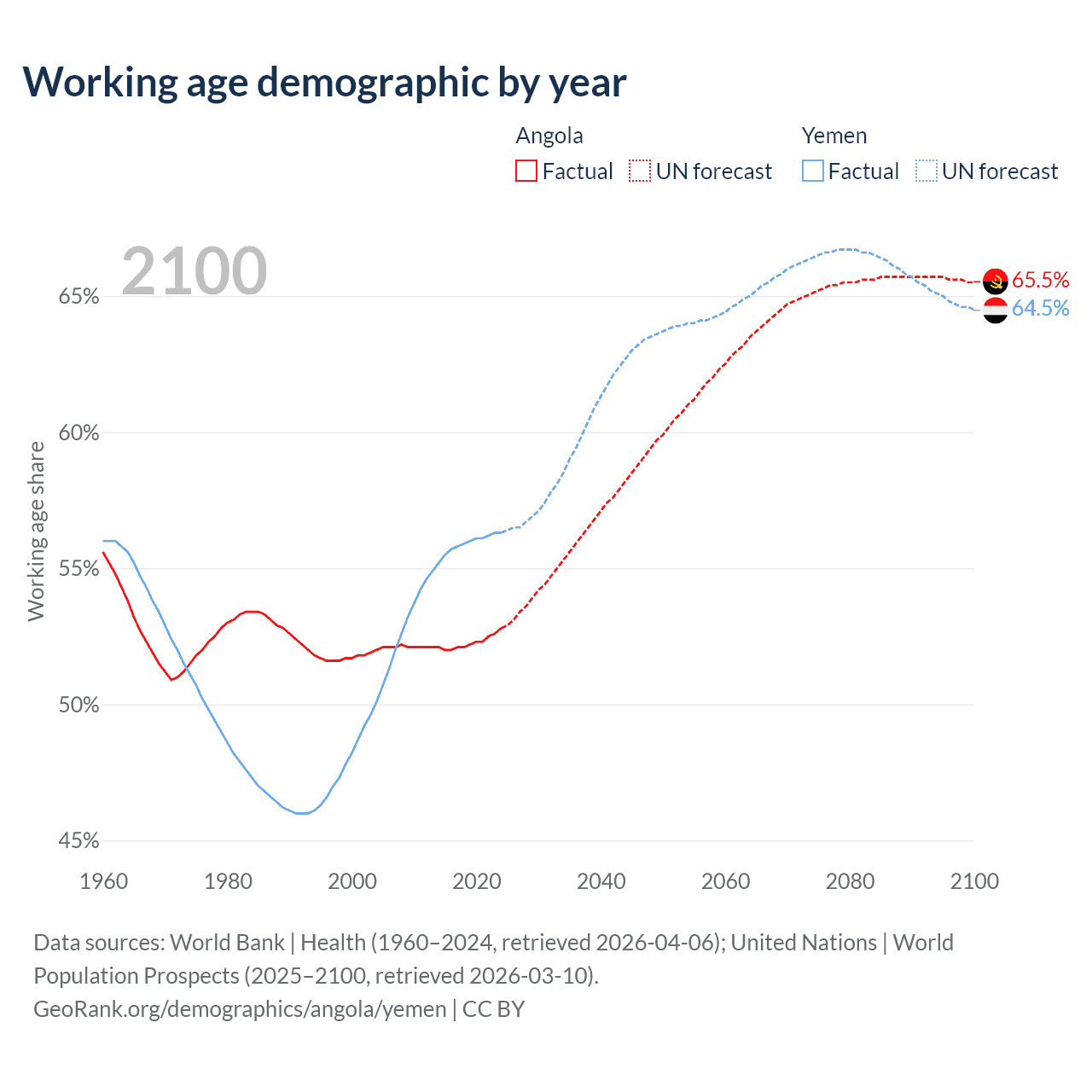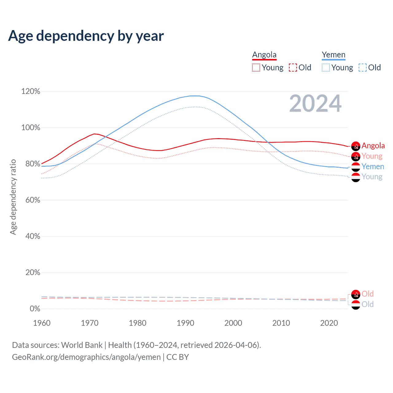 - The share of old-age demographic (65+) in Angola is 2.85% vs 2.52% in Yemen.