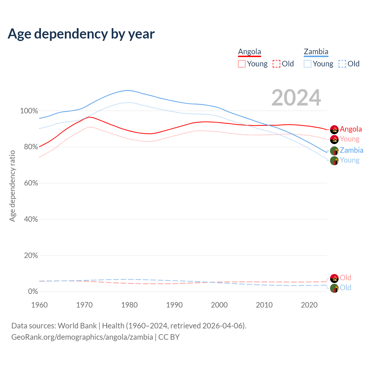 - Angola is ranked 188/196 by median age (oldest to youngest) vs 182/196 for Zambia.