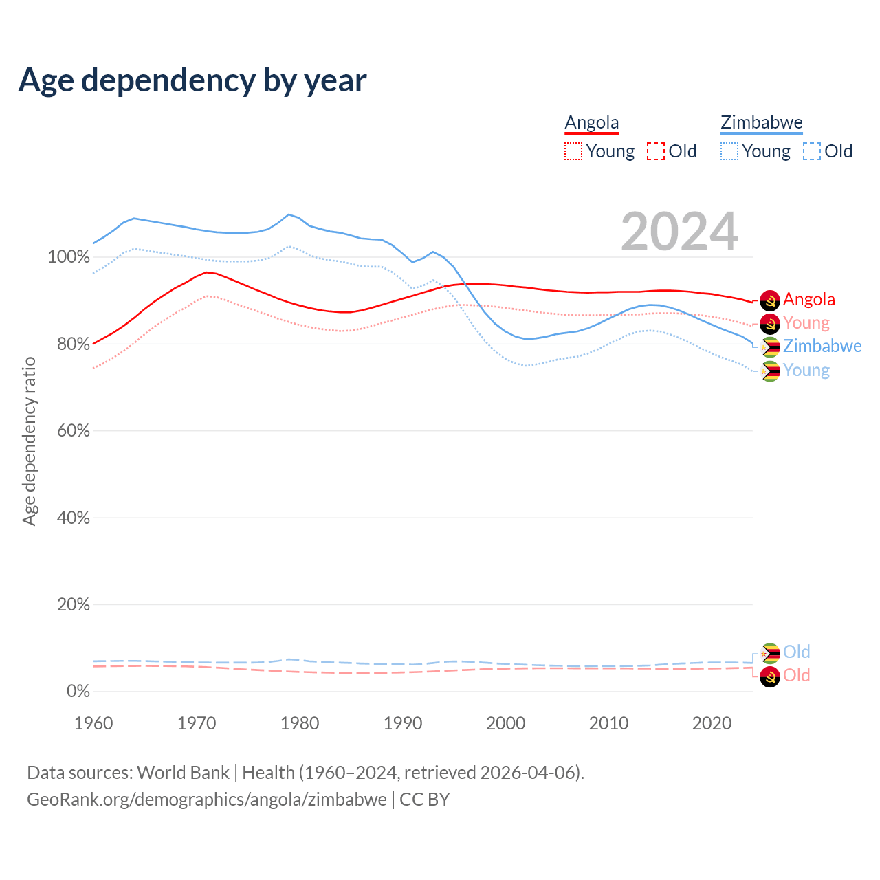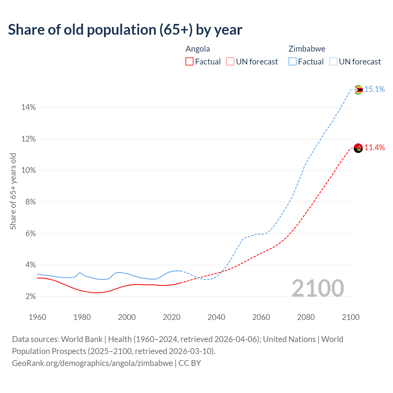 The share of older people aged 65 and over is 2.85% in Angola and 3.6% in Zimbabwe. Life expectancy in Angola compared to Zimbabwe .