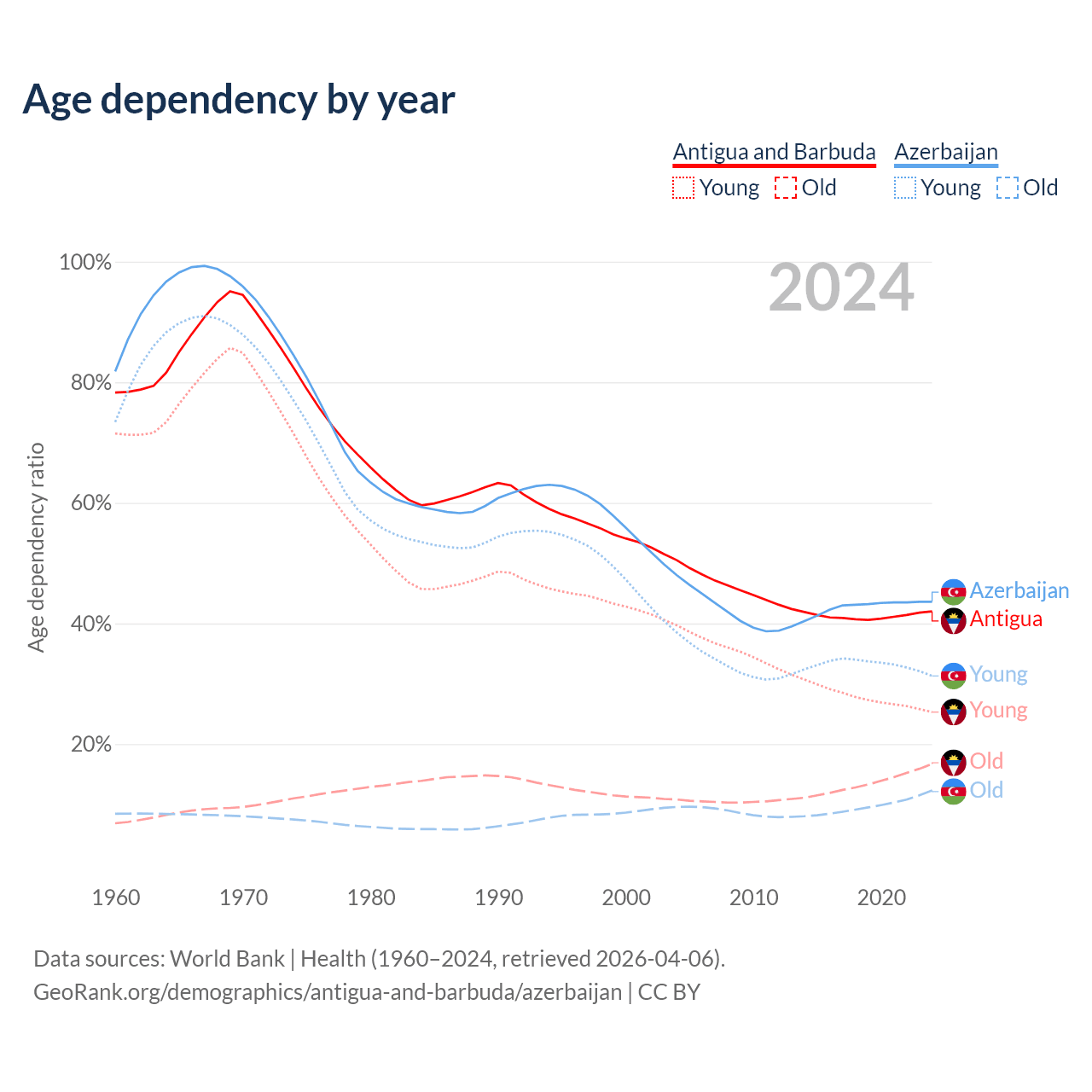 - The share of old-age demographic (65+) in Antigua and Barbuda is 11.8% vs 8.56% in Azerbaijan.