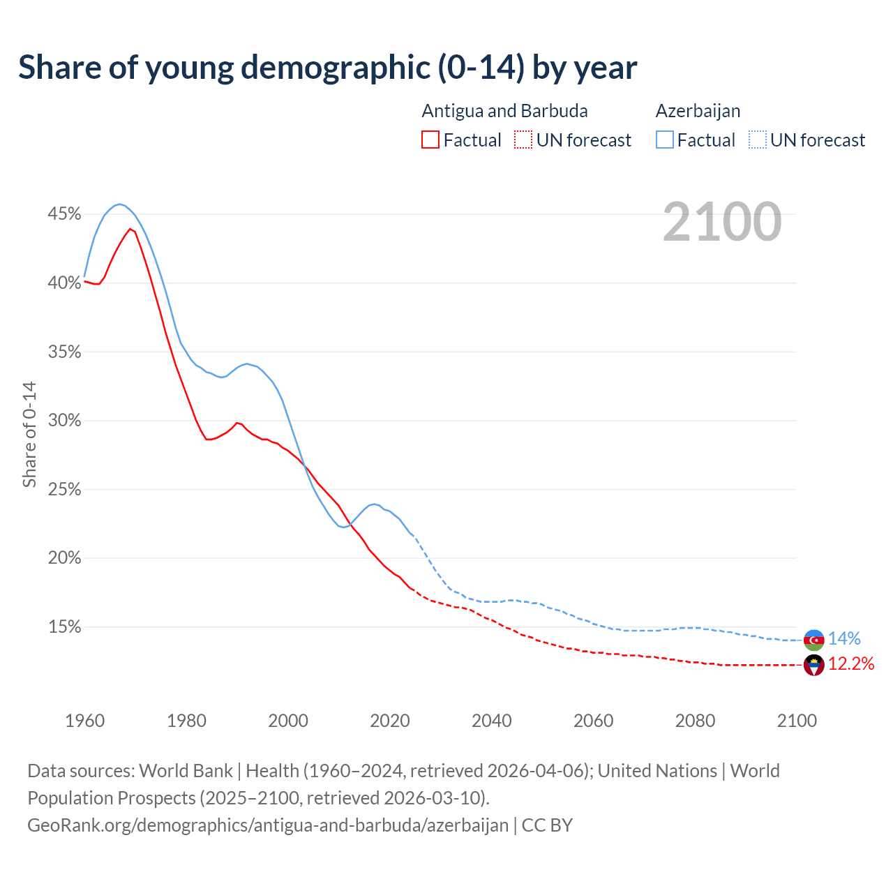 - The share of young demographic (0-15 years old) in Antigua and Barbuda is 17.8% vs 21.8% in Azerbaijan.