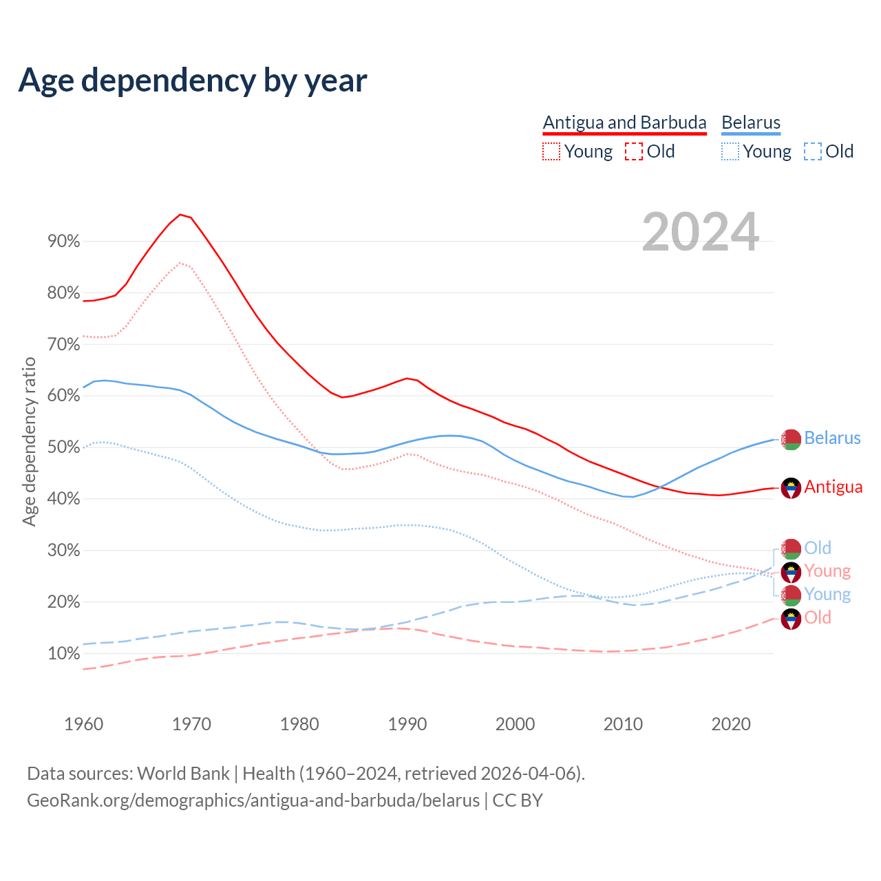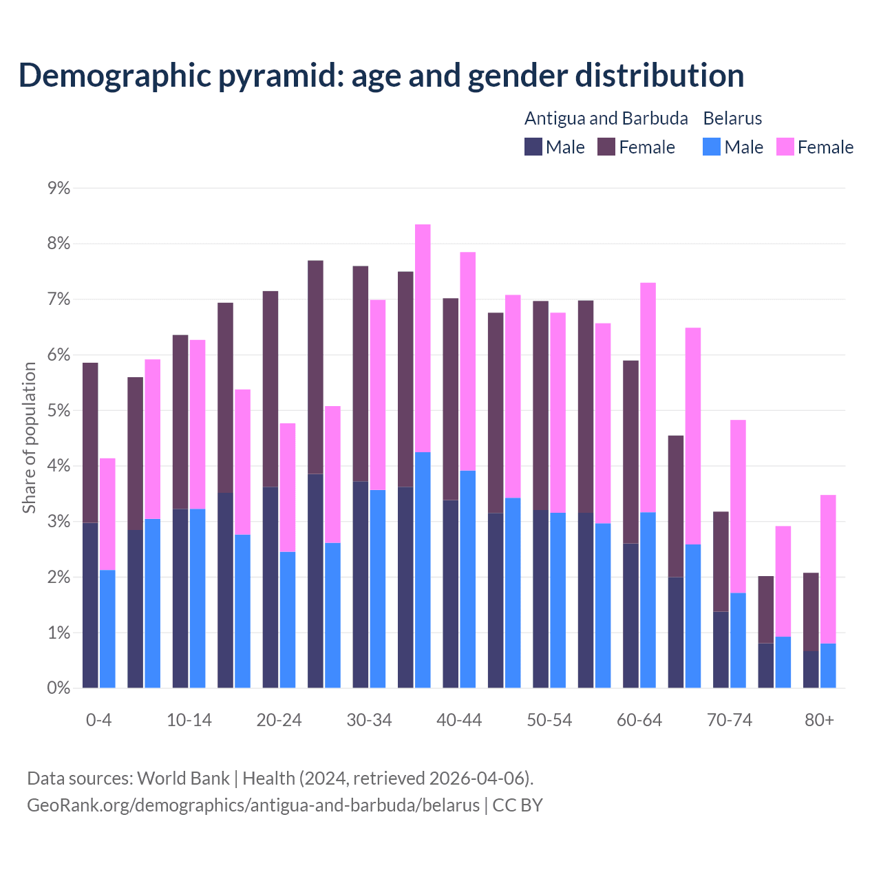 - Antigua and Barbuda is ranked 67/196 by median age (oldest to youngest) vs 35/196 for Belarus.