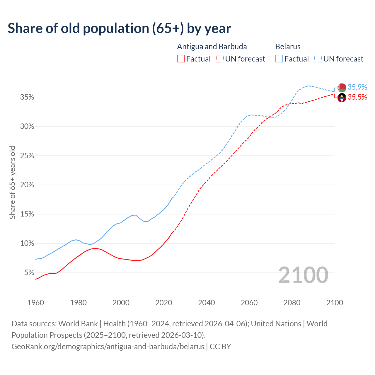 The share of older people aged 65 and over is 11.8% in Antigua and Barbuda and 17.7% in Belarus. Life expectancy in Antigua and Barbuda compared to Belarus .