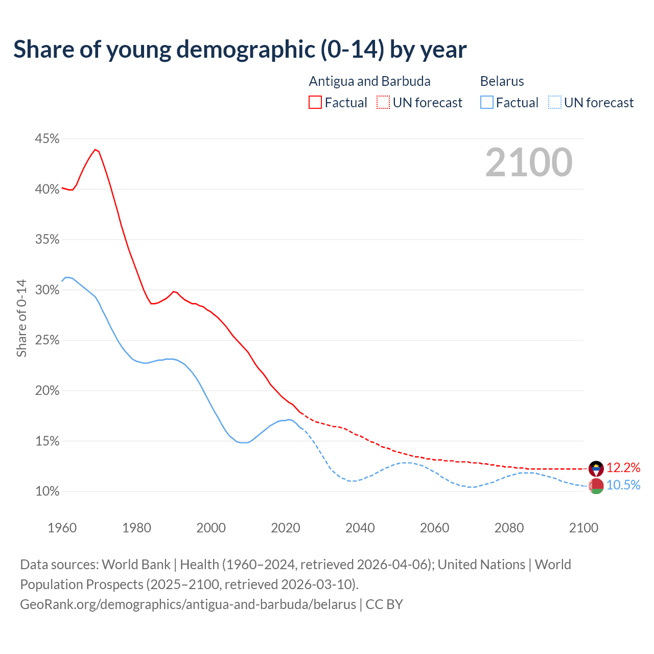 - The share of young demographic (0-15 years old) in Antigua and Barbuda is 17.8% vs 16.3% in Belarus.