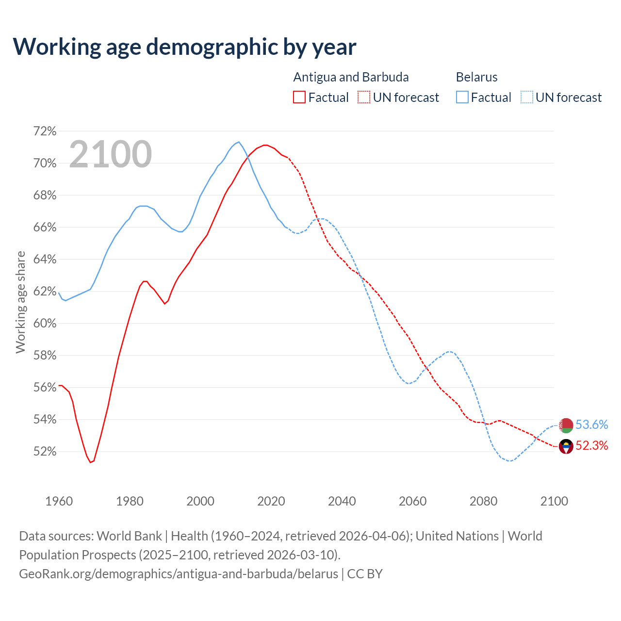 - Antigua and Barbuda has 66.7K working age adults (aged 15-64) vs 5.95M in Belarus.