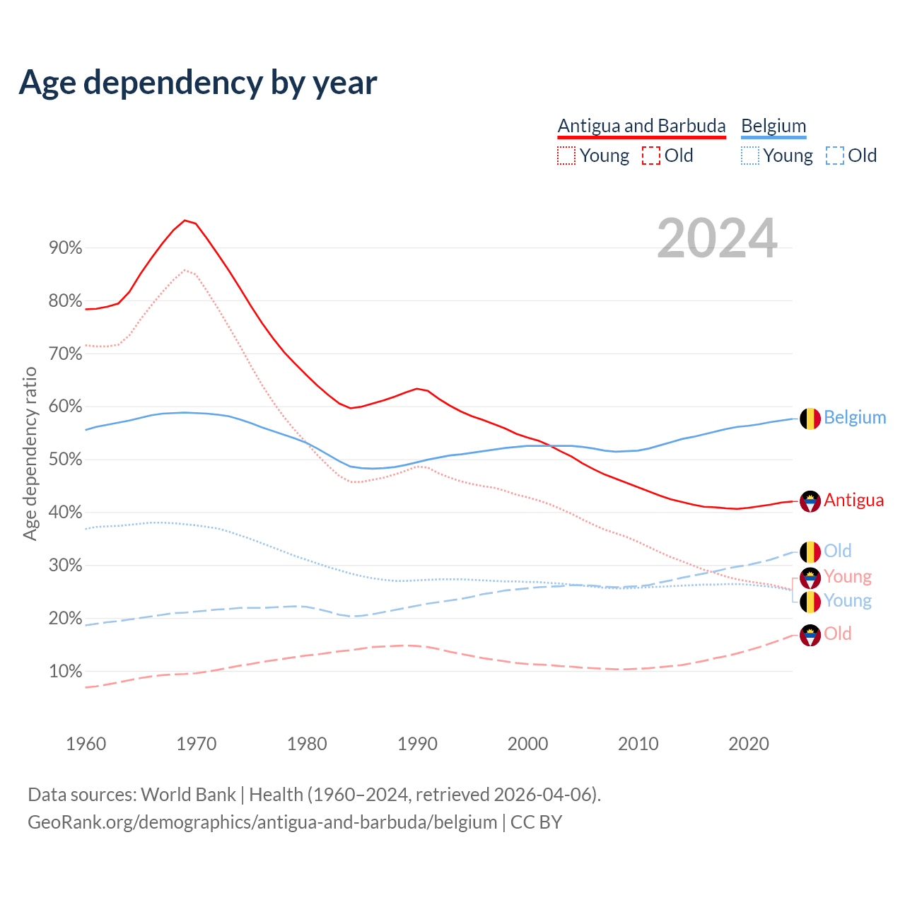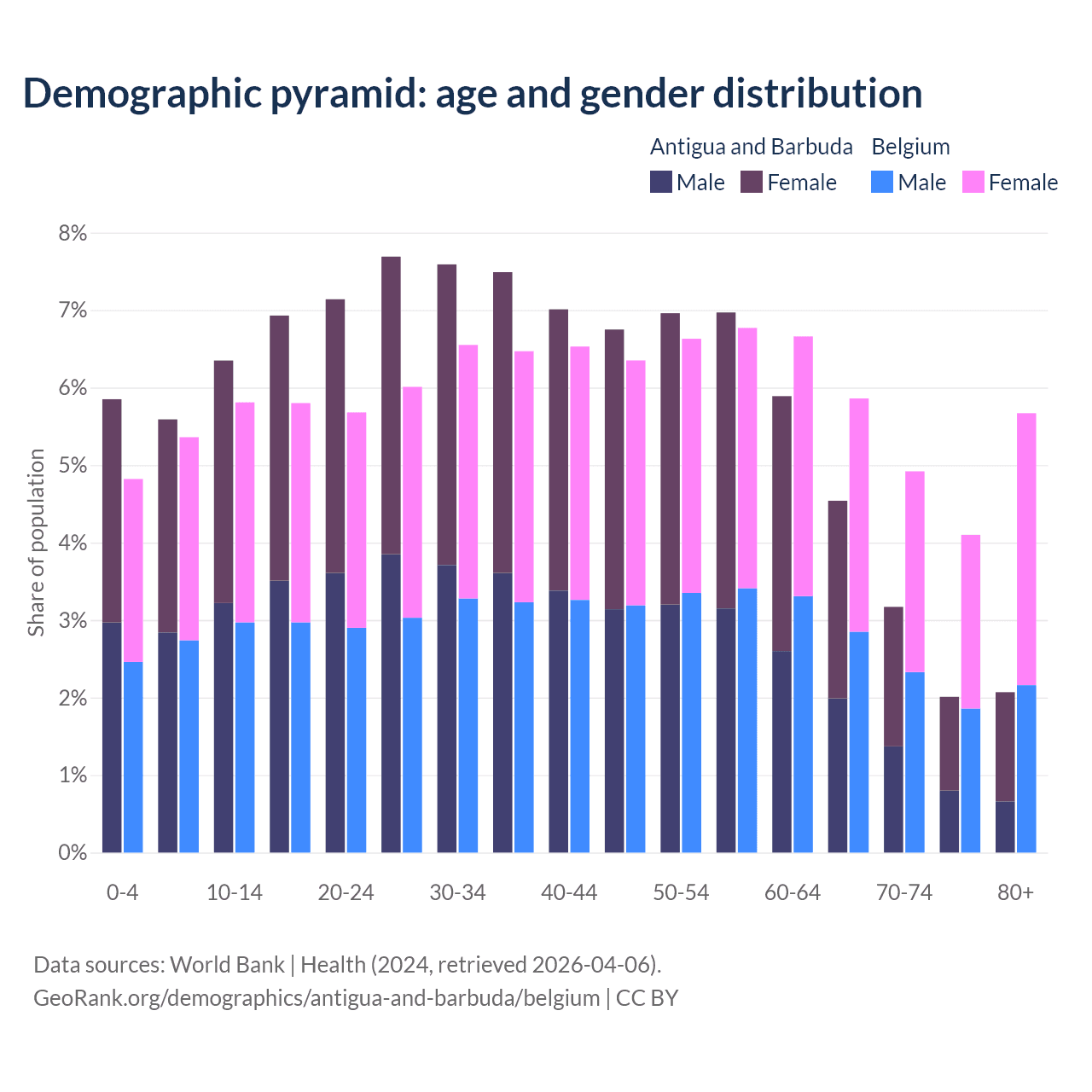 - Antigua and Barbuda is ranked 67/196 by median age (oldest to youngest) vs 32/196 for Belgium.
