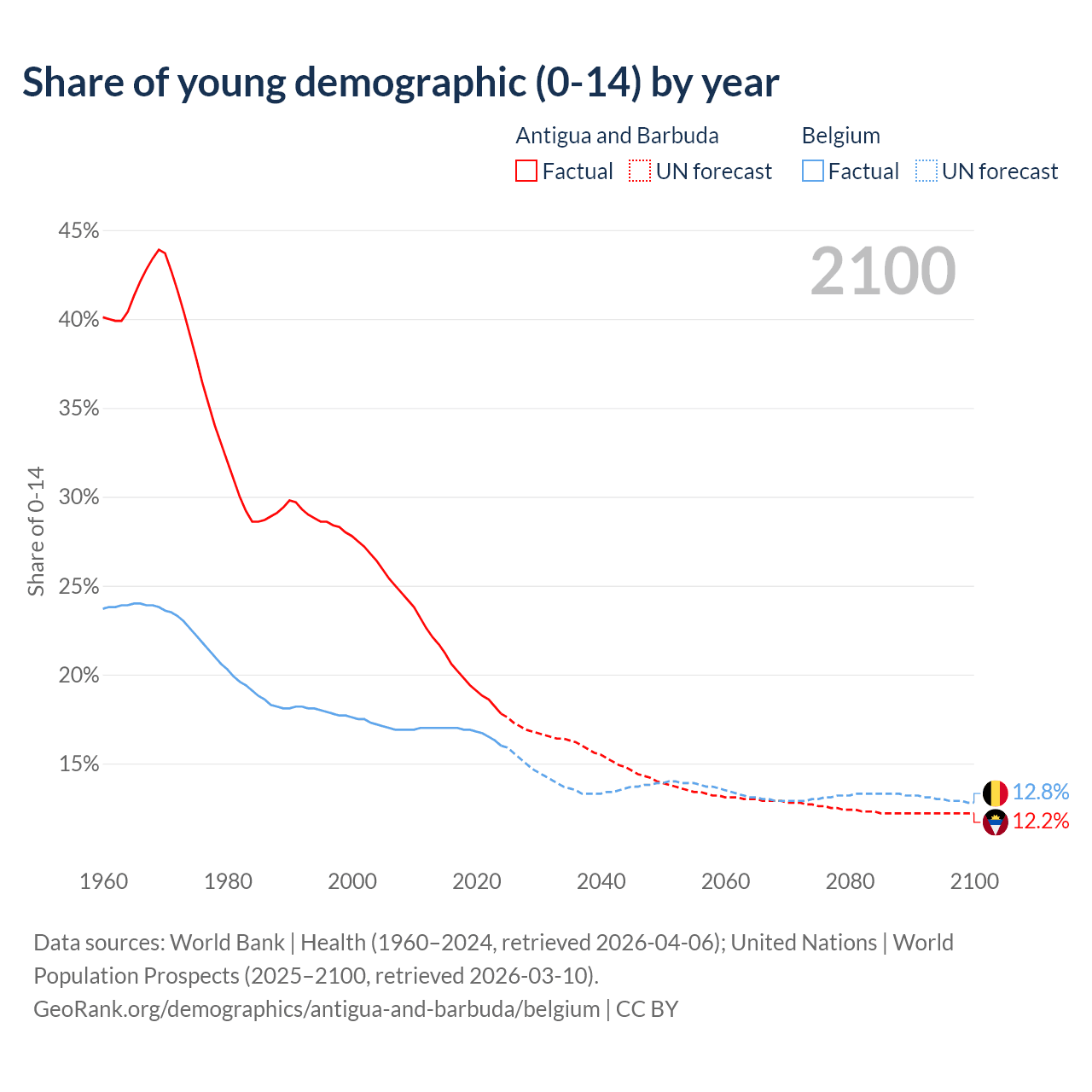 - The share of young demographic (0-15 years old) in Antigua and Barbuda is 17.8% vs 16% in Belgium.